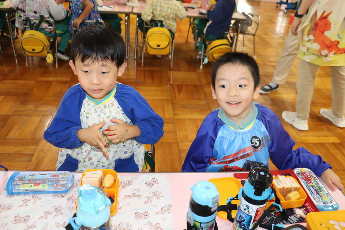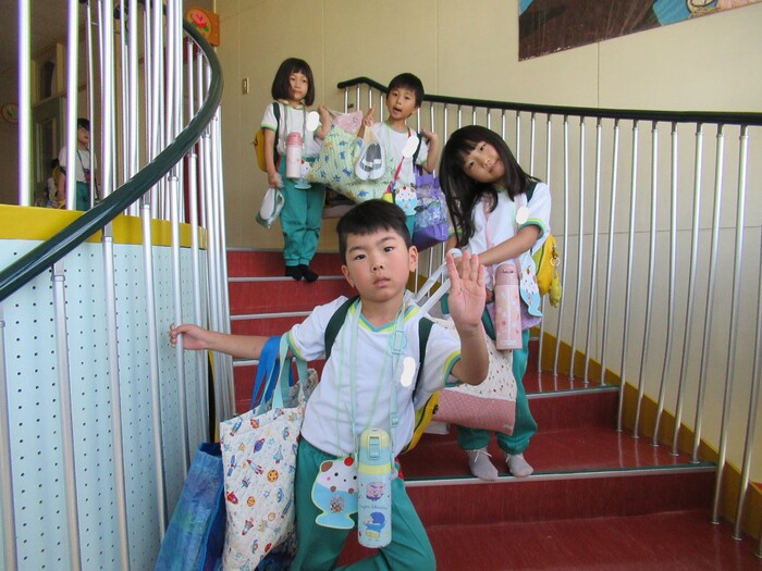 2日目の朝、「おはよ」と起きてきた子ども達は布団を片付け、着替えをしてからお散歩へ! 園の周りを一周すると、虫を見つけたり大きなフキを傘みたいとお話したり色々な発見をしたお散歩でした。 園に戻り元気いっぱいアンパンマン体操をした後は、朝ごはんの時間に! サンドイッチ・唐揚げ・ナポリタンと子ども達大好きなおかずでいっぱいでした!肝試しや昨日の思い出をたくさん話しながら楽しく食べました。そしてデザートにはスイカを食べました!とても甘くて子ども達もニコニコ笑顔! 楽しかったお泊り会もあっという間に終りの時間に・・・。頑張ったみんなにご褒美のプレゼントがありました! どの子も「お泊りたのしかった」「またみんな幼稚園にとまりたいな」とみんなで泊まることが楽しかった様子でした! 年長さん!お泊り会お疲れさまでした。おうちのひとからはなれてのおとまりかいがんばりました! いろいろなおはなしおうちのひとにもおしえてあげてね★ | ||