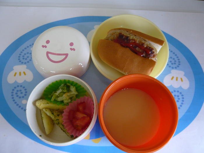 令和6年 8月28日(水) ★ ハンバーガー ★ ポテトフライ ★ コールスローサラダ ★ ミニトマト ★ コーンスープ | ||