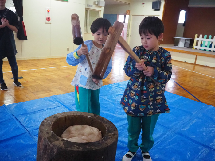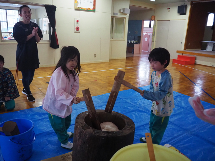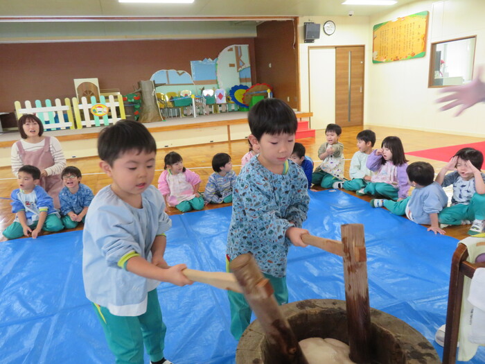 子ども達が楽しみにしていたもちつき会が12月3日に開催されました。ホールでは、元気な掛け声が聞こえ「よいしょ!!よいしょ!!」と杵で一所懸命に餅をつく姿が見られました。昼食時には、お汁粉に入れてお餅を美味しくいただきました。 | ||