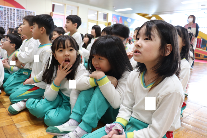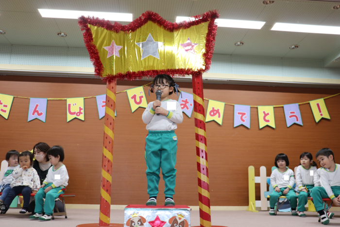 1月のお誕生者さんは、9名! ドキドキしながらも、元気いっぱい発表してくれました。 お楽しみは、ピクミンたちのマジックショー!! 「すごーい」「どうなっているの?」と、興味津々の子ども達。 大盛り上がりの誕生会になりました。 そんな、誕生会の様子をお見せします。 | ||