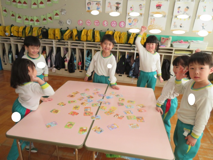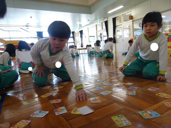 1月22日カルタ会の様子です。年少組は初め戸惑う子がいましたが少しずつルールを理解し取れなくても遊び自体を楽しんでいました。年中組は経験があるので張り切って参加していました。体を大きく使って手を伸ばし、大きな声で「はい!」と札を取っていました。年長組は冬休みから練習をしてきたと意気込む様子が見られます。迫力満点でスポーツ競技のように白熱していました。 | ||