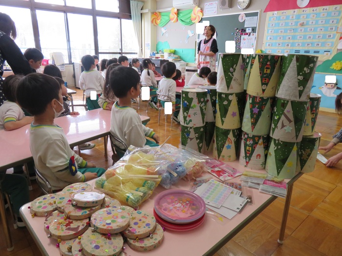 2月ちびっこランドの1回目は、製作遊び!2名のお友達と一緒に附属保育園リリーの2歳のお友達も参加しました。すずらん組のお兄さんお姉さん達のとってもやさしいサポートのもと、お店やさんごっこの品物(楽器)の製作をしました。シール貼りや紙芝居等、楽しい時間を過ごしました。 | ||