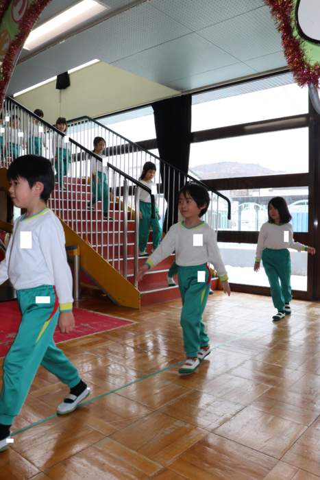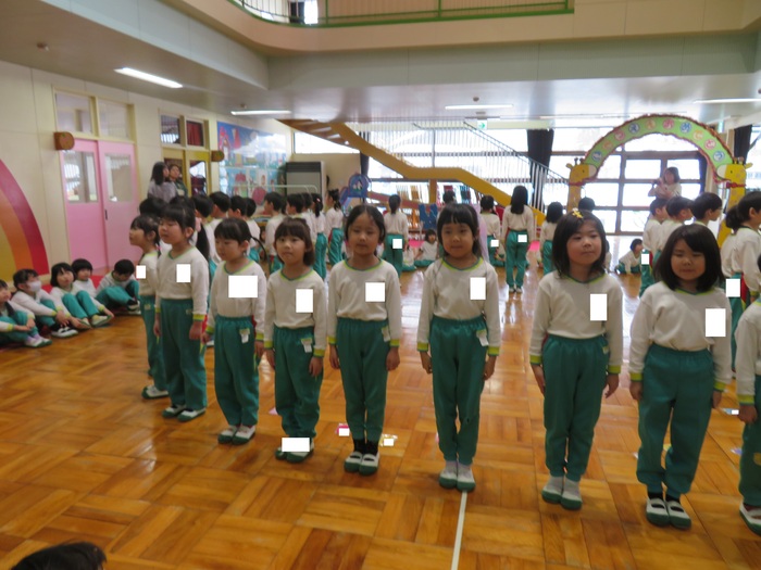 卒園を迎える38名の年長さんのお別れ会を行いました。 みんなで幼稚園にちなんだことや1年間を振り返った○×クイズをして、おやつを食べながら先生が作ったオリジナルストーリーのお話を見ました。ヒントを聞いて答えたり、自分が出て来て喜んでいる姿が見られました。 そして、年中・年少・満3歳児からの歌と言葉、年中組が作ったお守りをプレゼント。 お礼に年長組からも歌と言葉を贈りました。 | ||