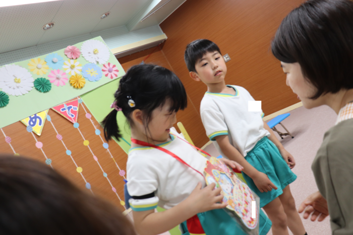 5月のお誕生者さんは、4名!! 誕生者さんのパーツクイズは、すぐに誰かわかっていました。 大きくなったら しなぷしゅ や 魔女になりたいという子もいました。 今月のお楽しみは人形劇でした。 なかよしなウサギさん、たぬきさん、きつねさんのお話に 子ども達も笑って楽しい時間を過ごしました! | ||