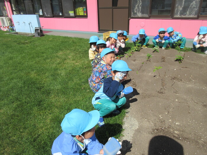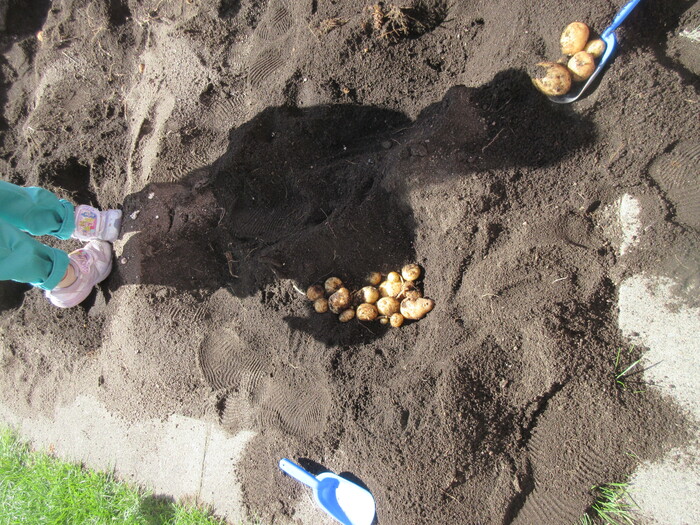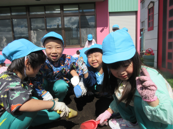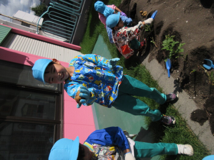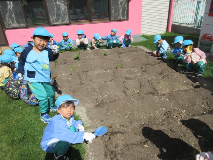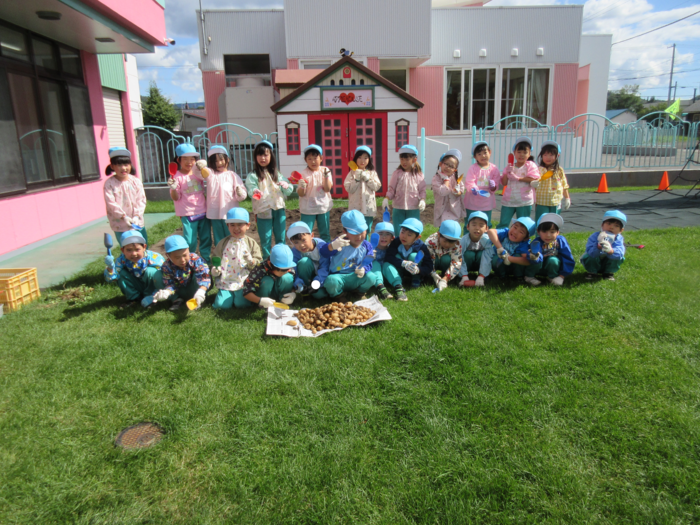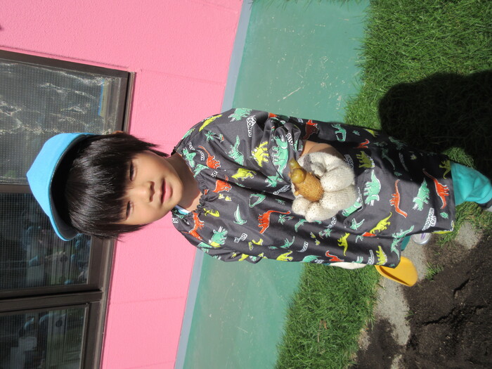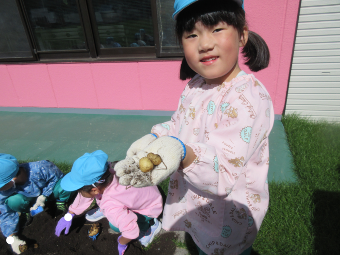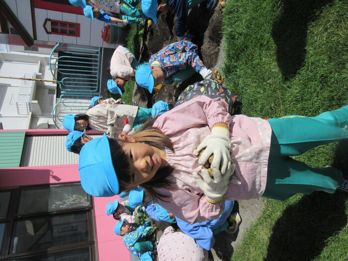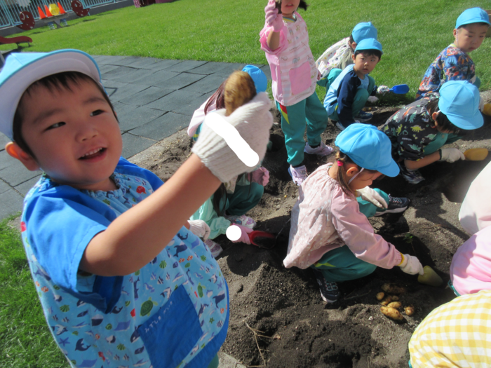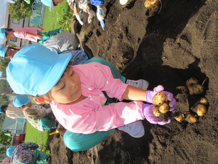 年長児が芋堀りをしました。春から大切に畑で育てていたじゃがいも。傷付けないように優しく掘っていくと、大きさも形も様々なじゃがいもが出てきました。自分たちで育てたじゃがいもはきっと特別な味がするはず!食べる日が待ち遠しいです! | ||
