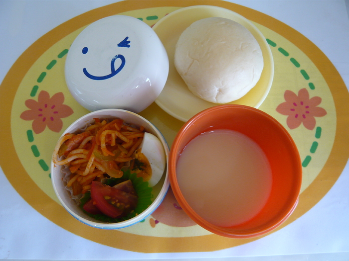令和7年 9月24日(水) ★ パン ★ ナポリタン ★ ゆで卵 ★ トマト ★ コーンポタージュ | ||
