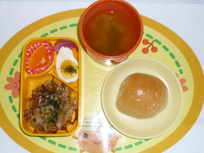 令和7年 10月1日(水) ★ パン ★ ソース焼きそば ★ ハムエッグ ★ オレンジ ★ スープ | ||