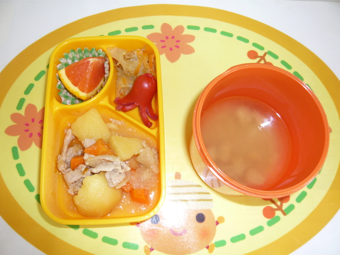 令和7年 10月6日(月) ★ 肉じゃが ★ たこさんウインナー ★ れんこんのきんぴら ★ オレンジ ★ みそ汁 | ||
