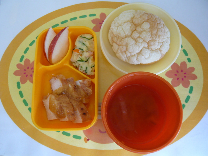 令和7年 10月8日(水) ★ パン ★ タンドリーチキン ★ ポテトサラダ ★ リンゴ ★ スープ | ||