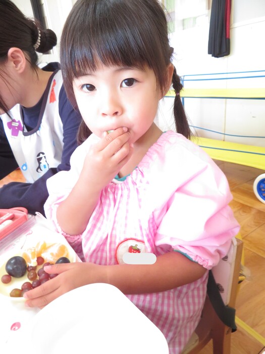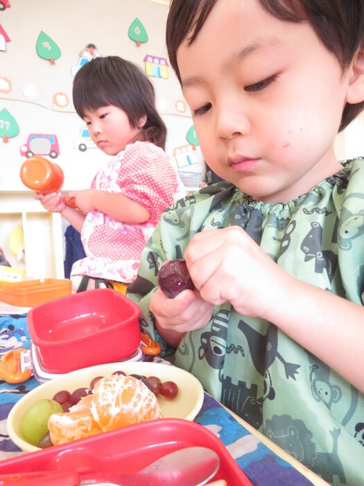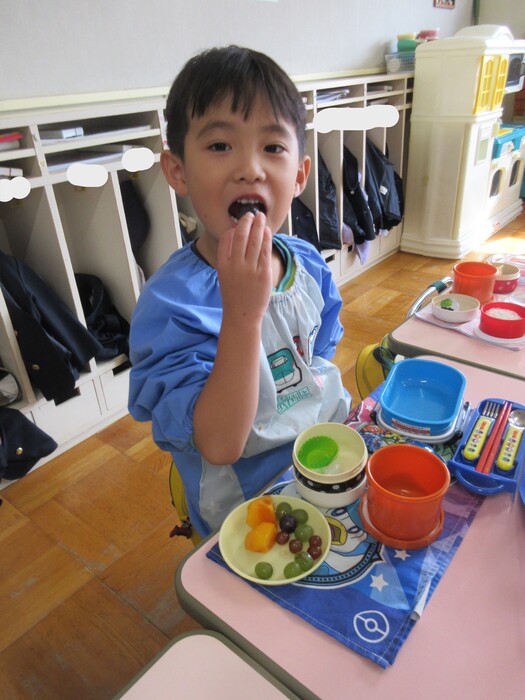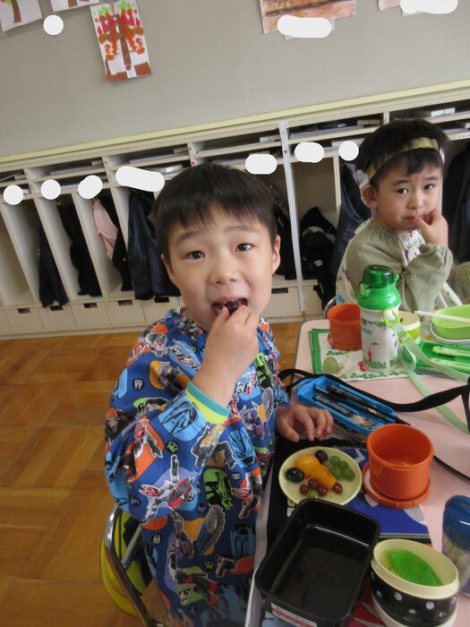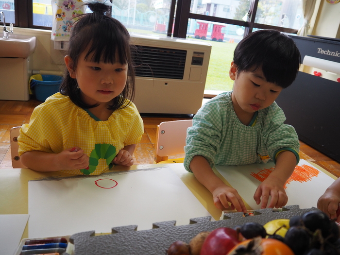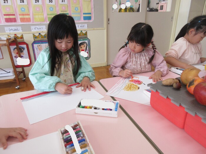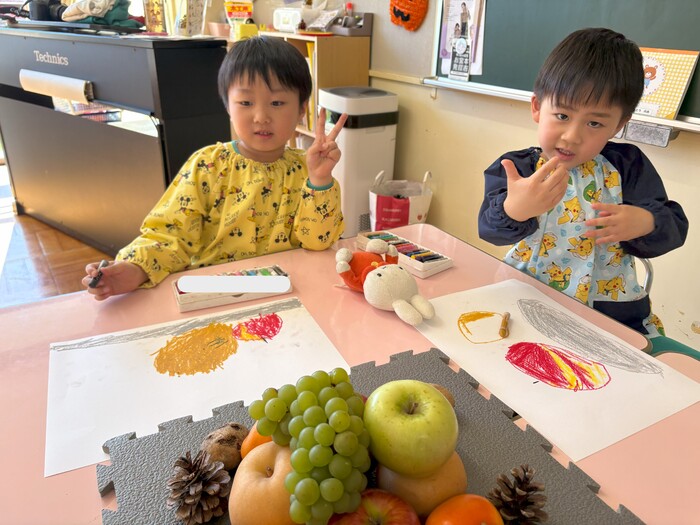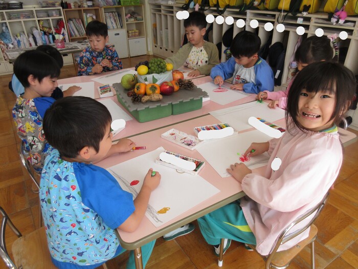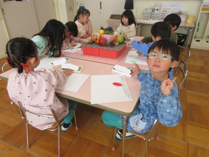 〖食欲の秋〗ということで、ご家庭から果物を用意して頂き、ぶどう・なし・りんごなど色々な果物が集まりました。机に並べた果物・まつぼっくり・年長さんが作ったジャガイモを観察しながらクレヨンで上手に描いてました。 果物はみんなで美味しく頂きました。ご家庭からの果物のご協力ありがとうございました。 | ||