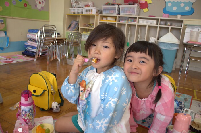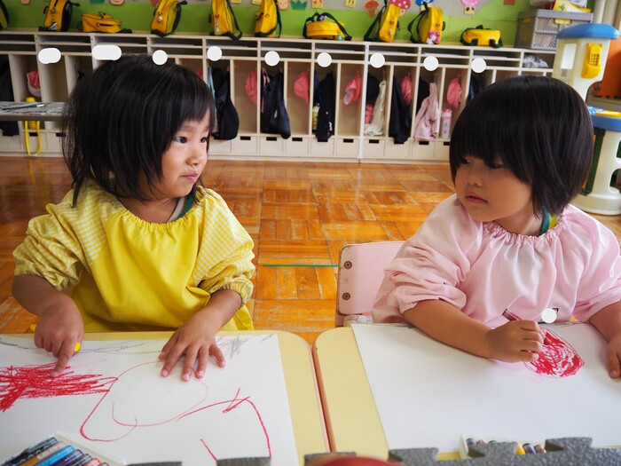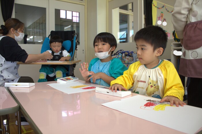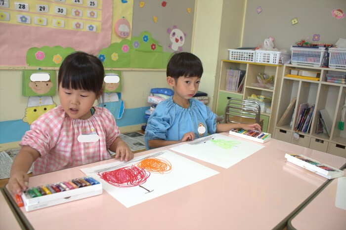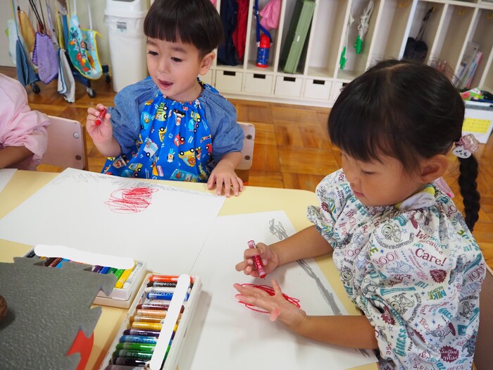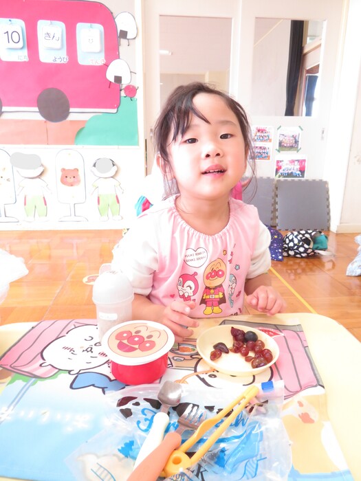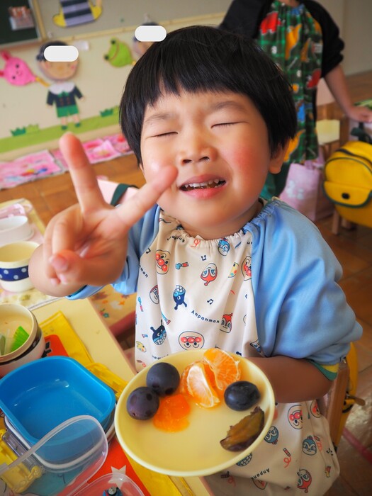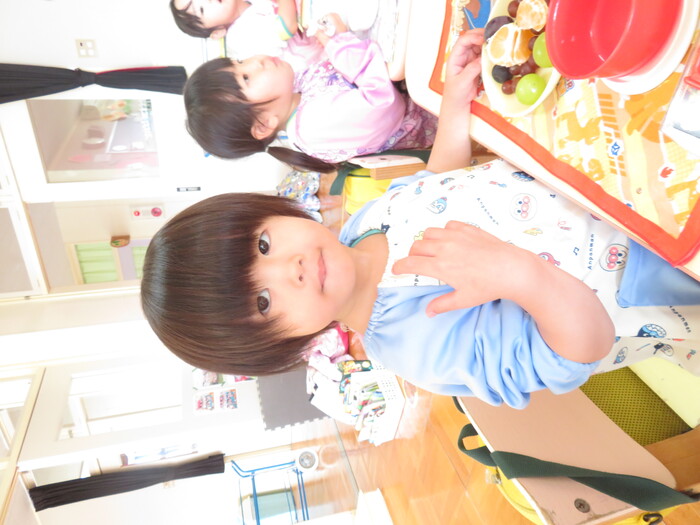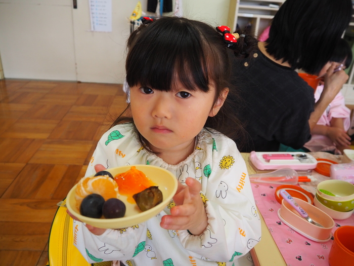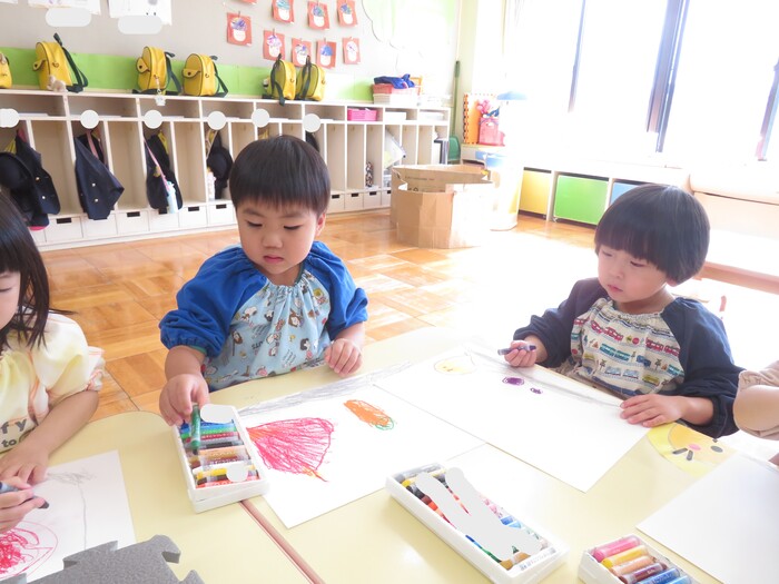 〖食欲の秋〗ということで、ご家庭から果物を用意して頂き、ぶどう・なし・りんごなど色々な果物が集まりました。机に並べた果物・まつぼっくり・年長さんが作ったジャガイモを観察しながらクレヨンで上手に描いてました。 果物はみんなで美味しく頂きました。ご家庭からの果物のご協力ありがとうございました。 | ||