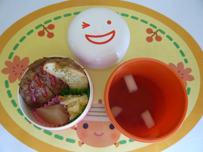令和7年10月14日(火) ★ ハンバーグ ★ コールスローサラダ ★ ポテトフライ ★ もも缶 ★ すまし汁 | ||