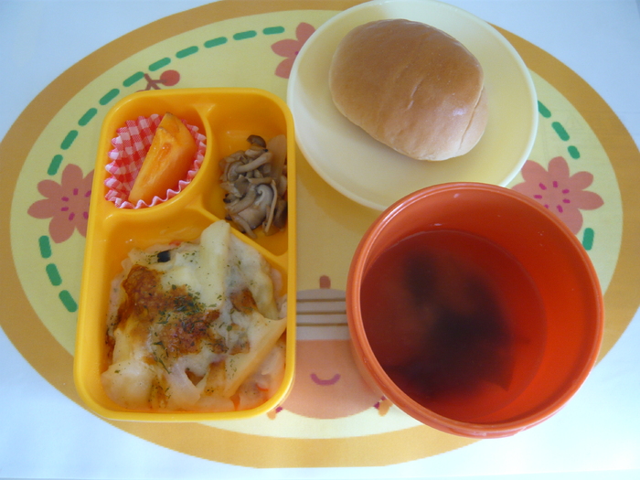 令和7年10月15日(水) ★ パン ★ シーフードグラタン ★ きのこの炒め物 ★ 柿 ★ スープ | ||
