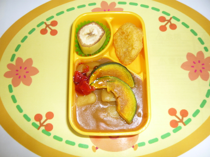 令和7年10月16日(木) ★ 秋野菜カレー ※年長児が育てた じゃがいもを使用 ★ ナゲット ★ 福神漬け ★ バナナ | ||
