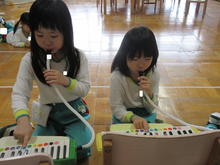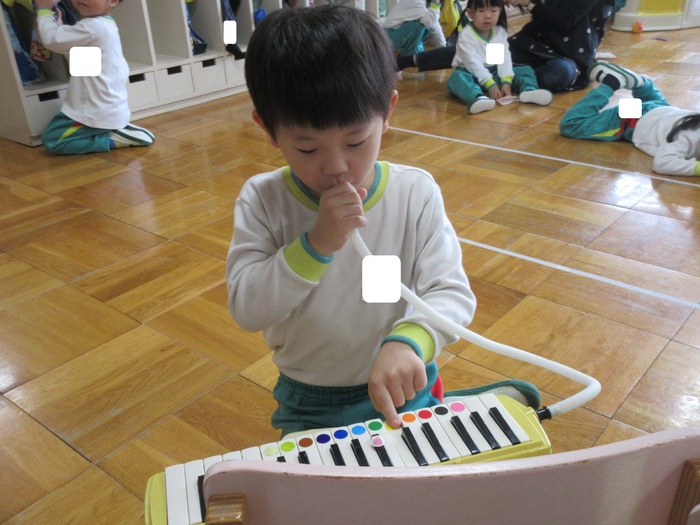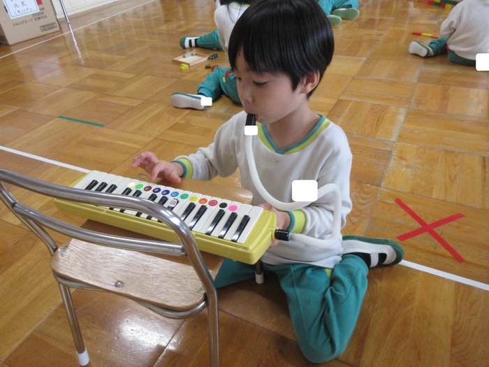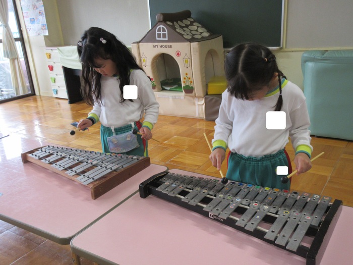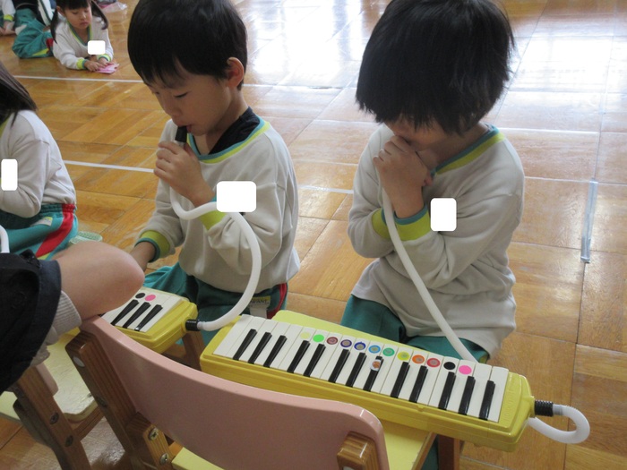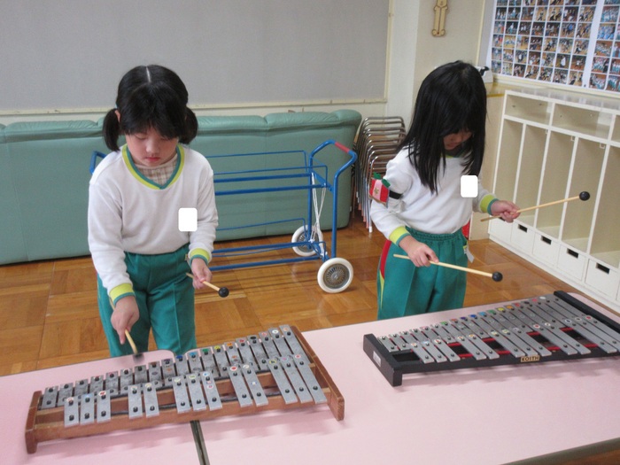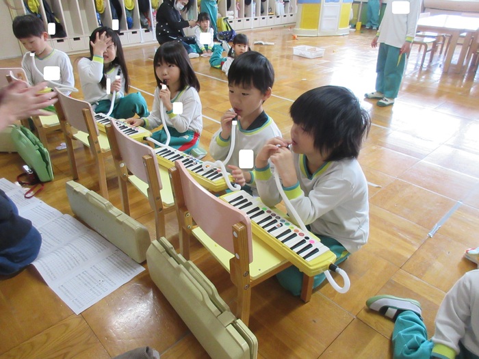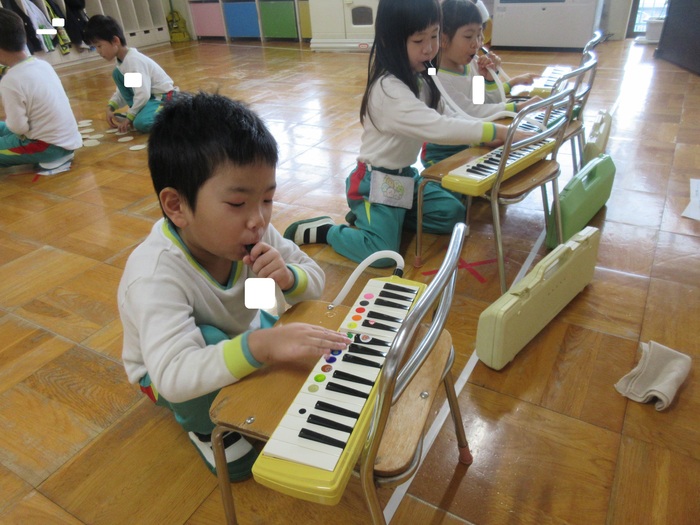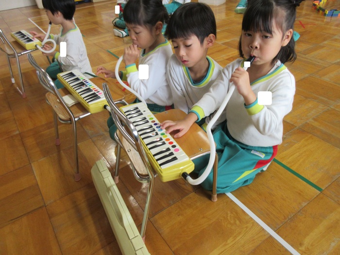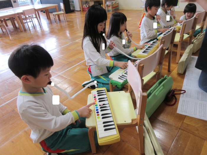 12月20日(土)の発表会に向けての練習が今週から少しずつ始まりました。 各クラスの先生は、夏休み中から発表曲を選ぶ等、発表会に向けての準備を進めていました。先月末頃、発表曲を子ども達が鑑賞。いよいよ、発表会に向けての取り組みがスタート。今月の初めから中旬頃に楽器の担当や配役が決定し、練習へと入りました! 楽器は、全クラスの先生達が各パートに分かれて練習を担当しています。子ども達は、初めて楽器に触れる…という子もいるようですが『先生、楽器の練習しよう!』『楽器、練習しても良い!』と意欲満々です。子ども達のやる気を大切にしながら〝出来た!〟という成功体験を味わいながらそれを自信に繋げ、クラス全員で協力し〝発表会〟という大きな目標を成し遂げられるよう頑張っていこうと思っています。 ★ 学年ごとに子ども達の様子を紹介していきます! 第1回目は【年長組】です!★ | ||