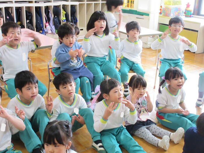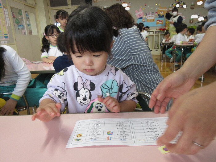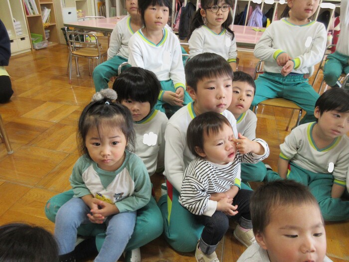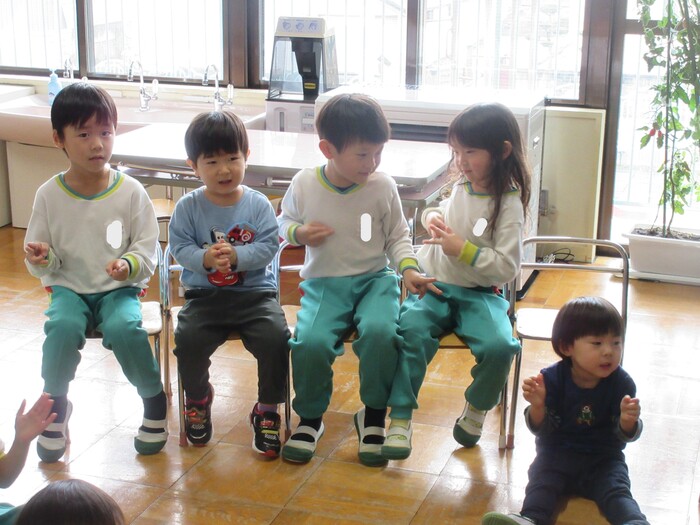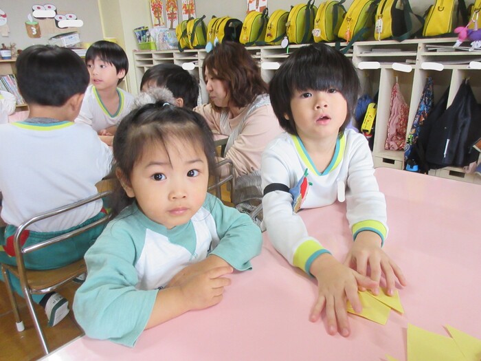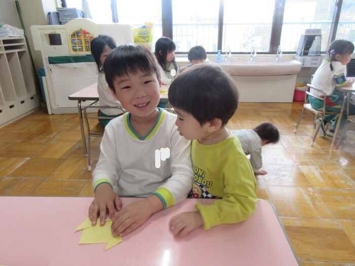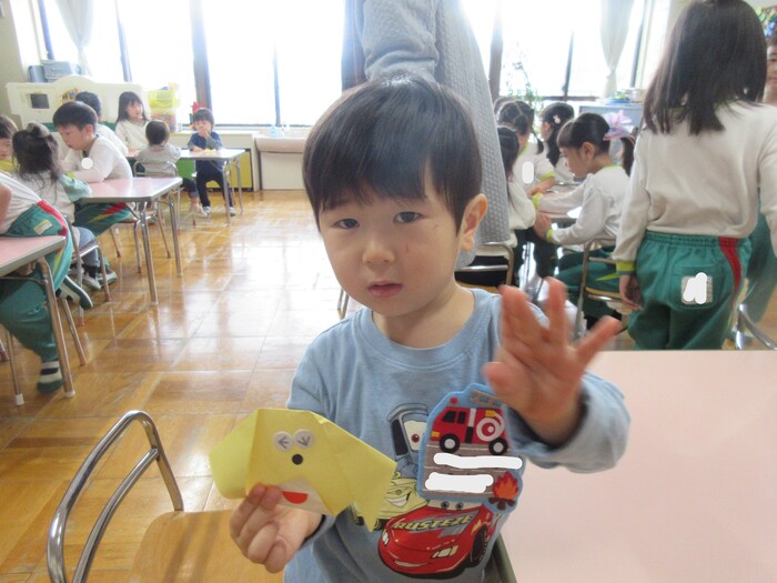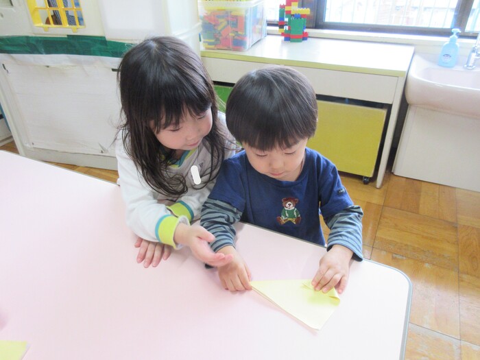 10月のちびっこランド3回目は、22日(水)に実施しました。 今回は、折り紙遊びを行いました! ゆり組のお兄さんお姉さんに教えてもらいながら、いぬさんをみんなで折りました。 みんな上手に出来て嬉しそうでした! | ||