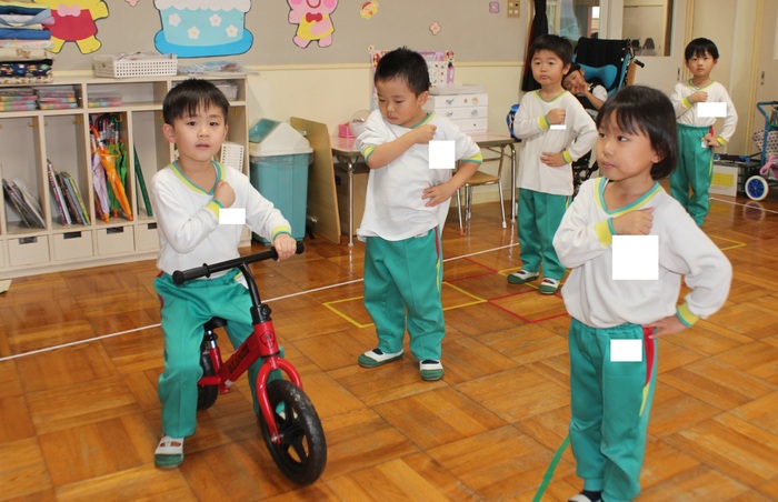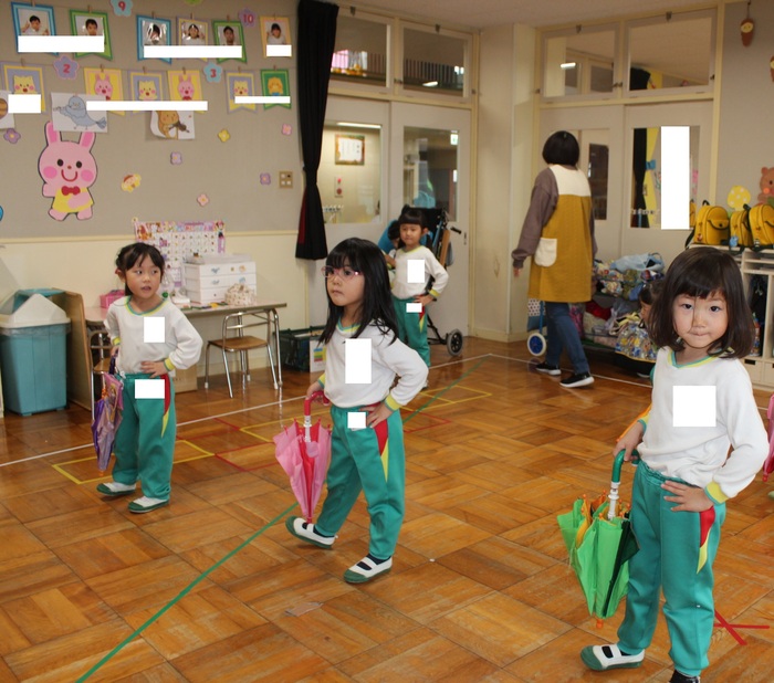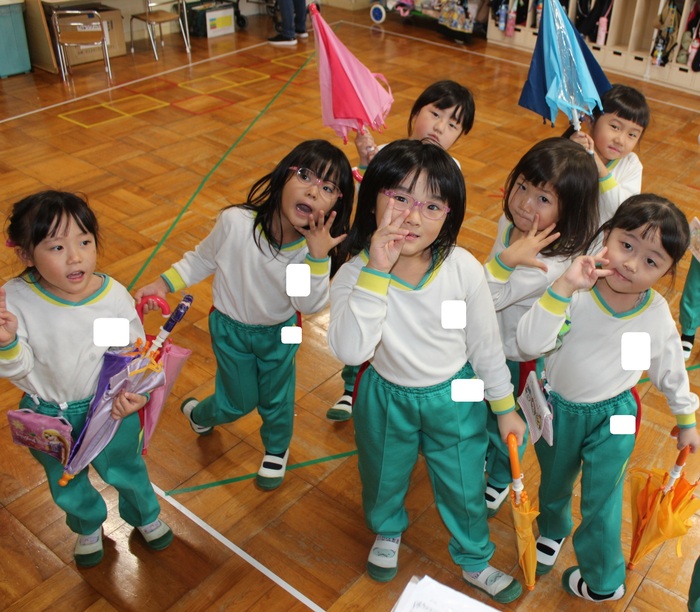 男の子の練習時間には、元気いっぱいの声が聞こえ、 女の子の練習時間は傘を片手に可愛らしい振り付けで踊っています。 保護者の方の手作り衣装を着て踊る本番が今から楽しみですね! | ||