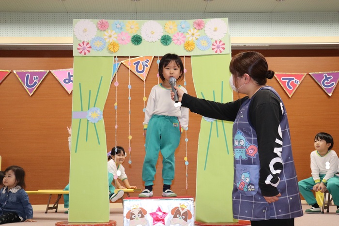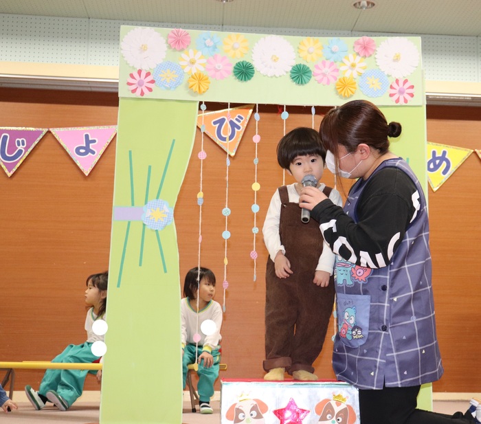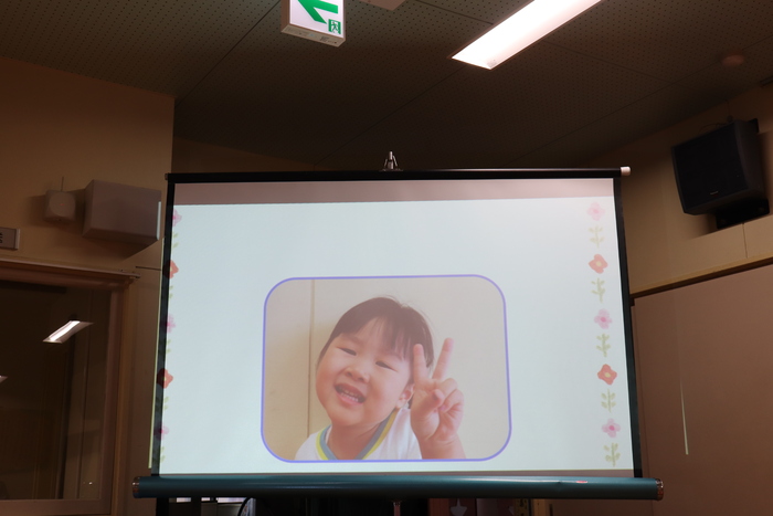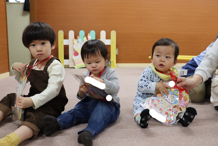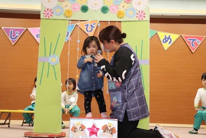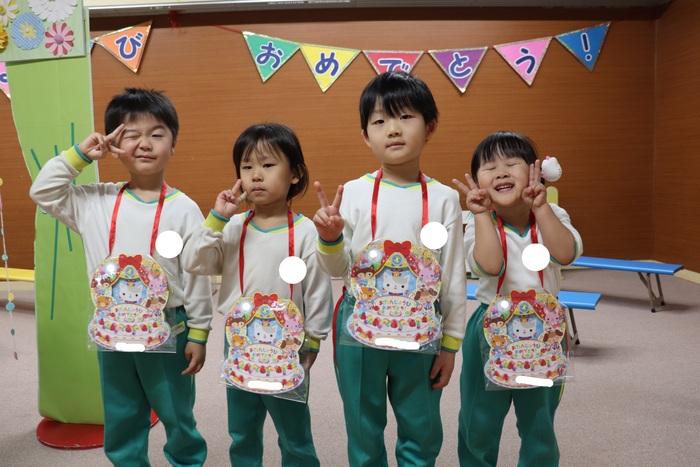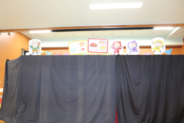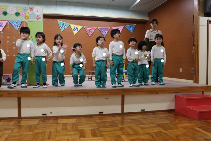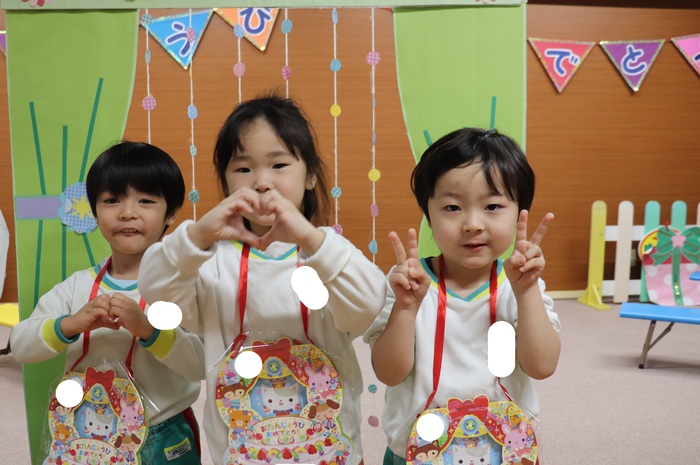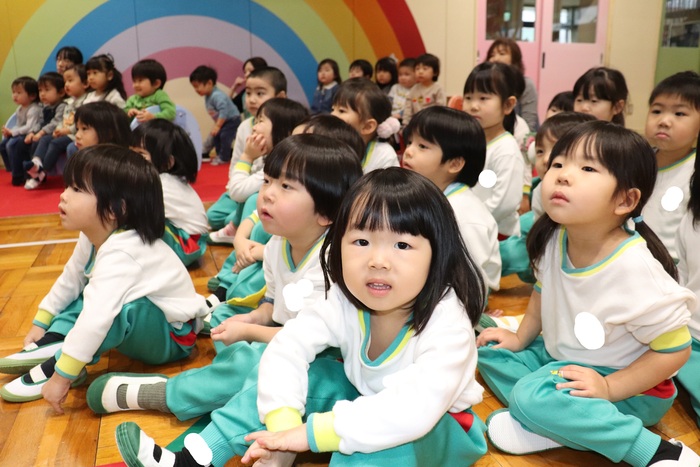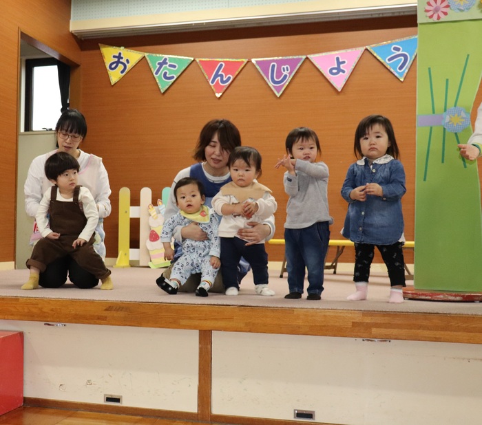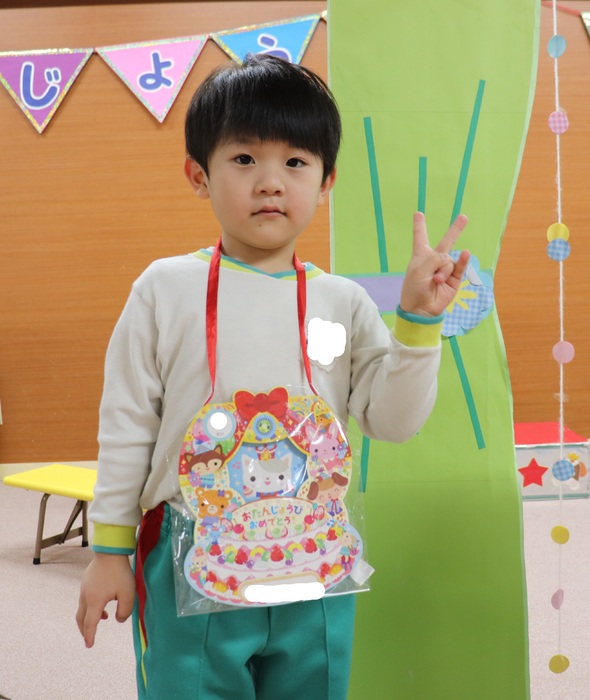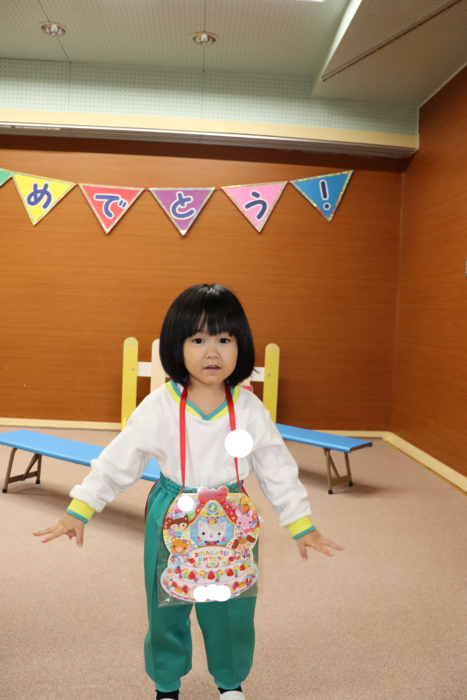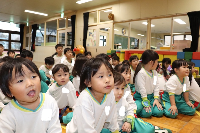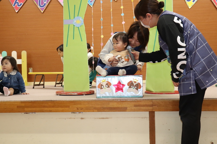 11月の誕生会では、15人のお友だちをお祝いしました。(2名は10月の誕生会で欠席でしたので、今回一緒にお祝いしました)元気に発表する子や緊張しながらも一生懸命行う子、保育園リリーのお友だちも泣かずに笑顔でステージに座っていました。 お楽しみは、パネルシアター「食べるでござる」!猫忍者のように何でも好き嫌いせず、元気な身体を作りましょうね! | ||