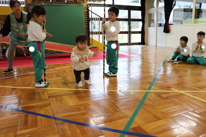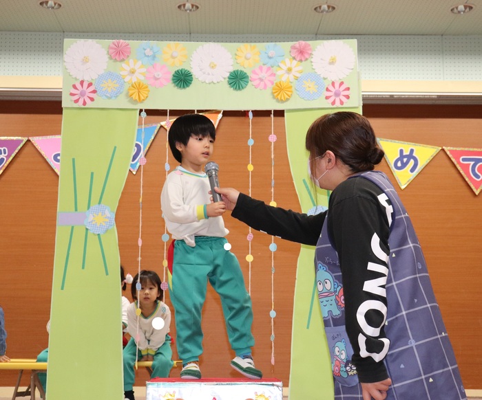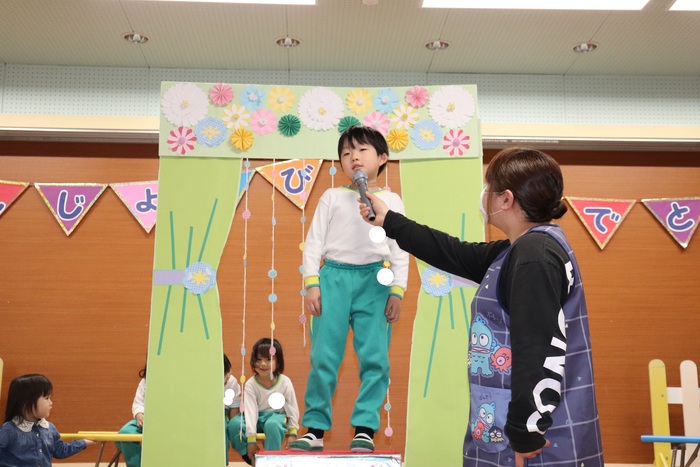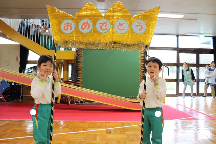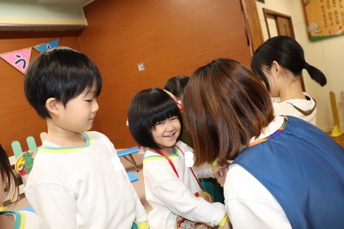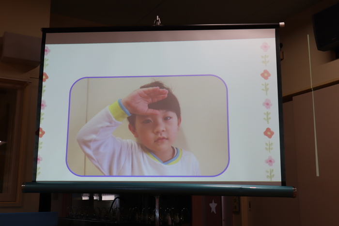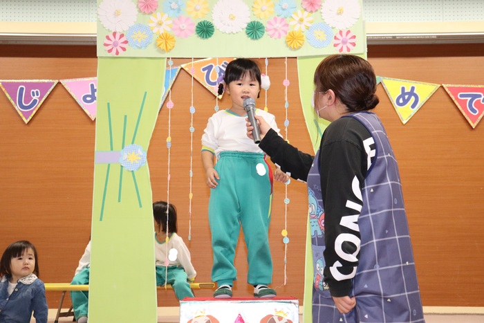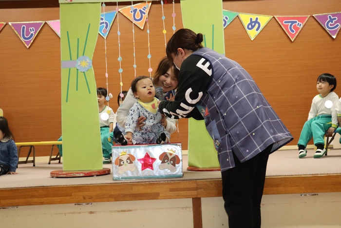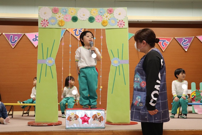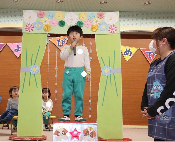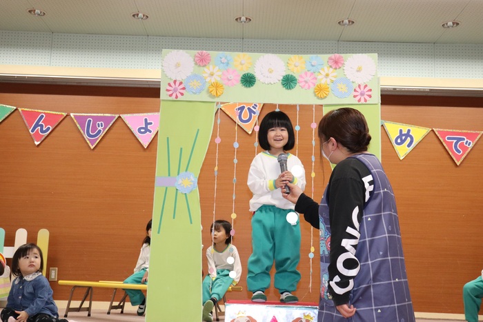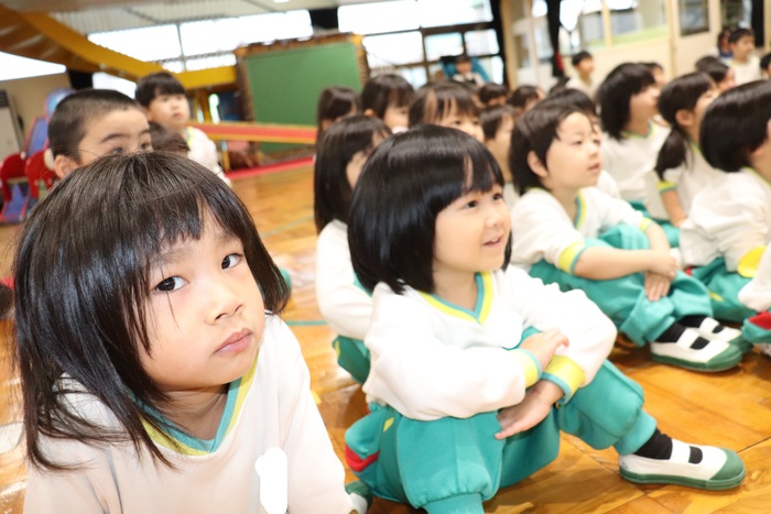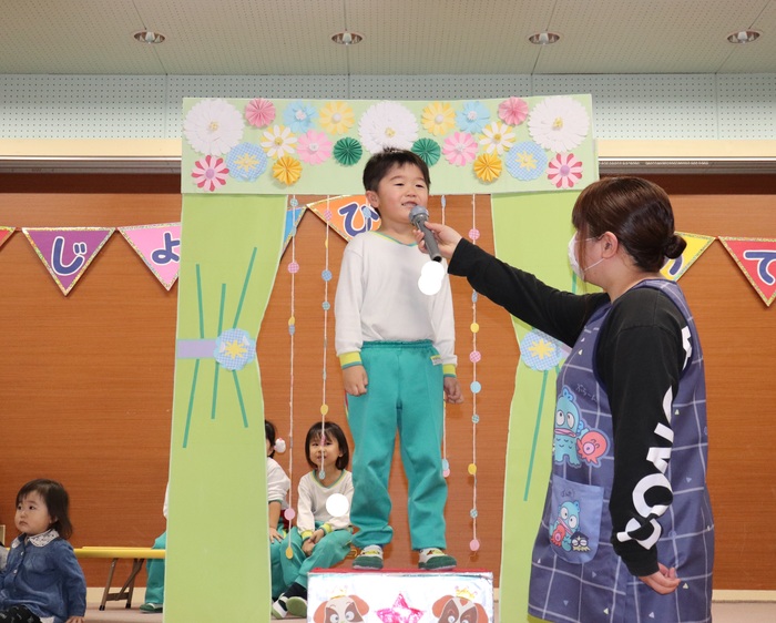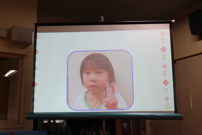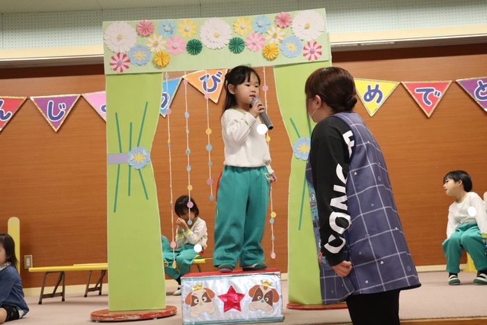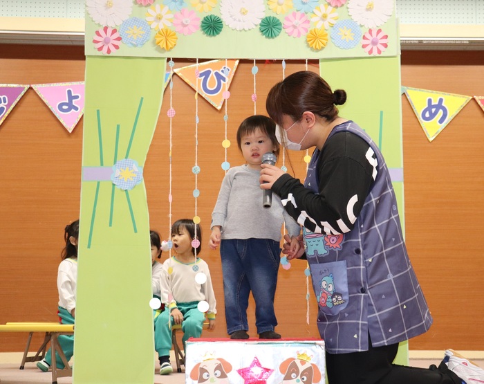 11月の誕生会では、15人のお友だちをお祝いしました。(2名は10月の誕生会で欠席でしたので、今回一緒にお祝いしました)元気に発表する子や緊張しながらも一生懸命行う子、保育園リリーのお友だちも泣かずに笑顔でステージに座っていました。 お楽しみは、パネルシアター「食べるでござる」!猫忍者のように何でも好き嫌いせず、元気な身体を作りましょうね! | ||