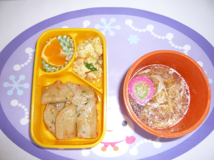 令和7年 12月15日(月) ★ すり身のテリヤキ ★ 野菜の卵とじ ★ みかん ★ 醤油ラーメン | ||