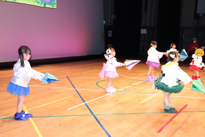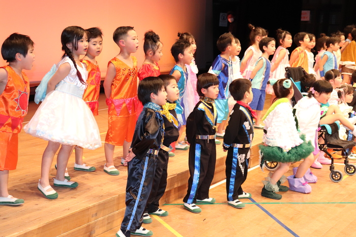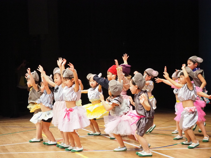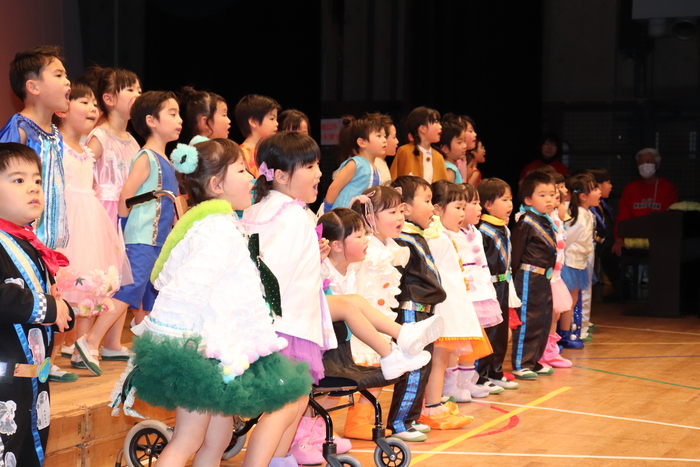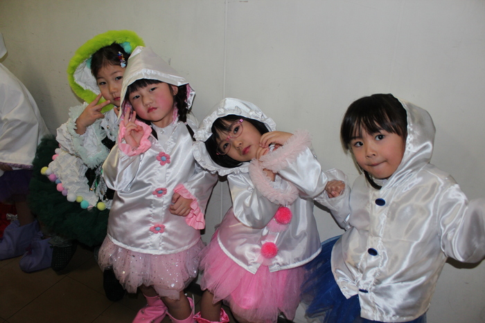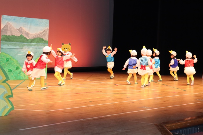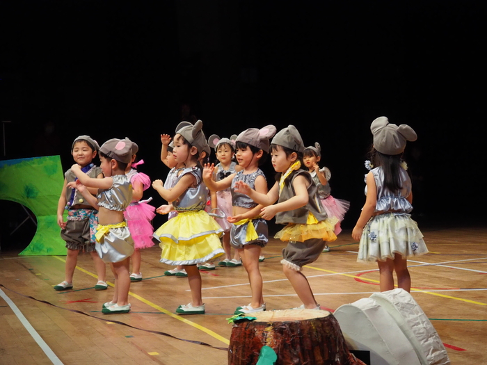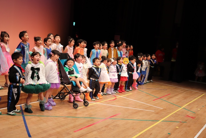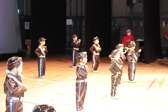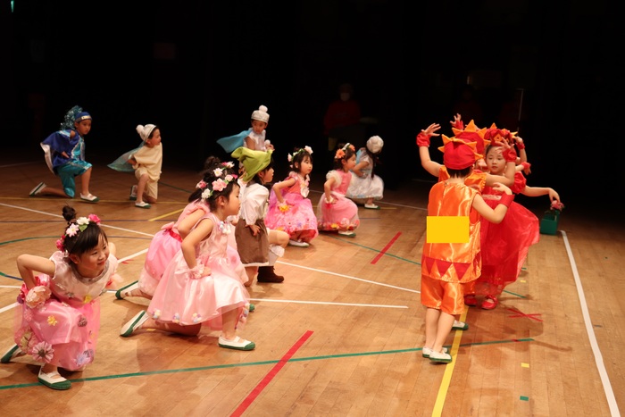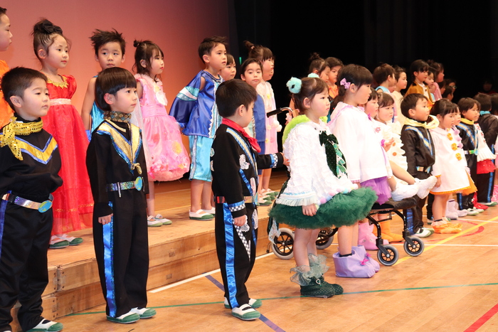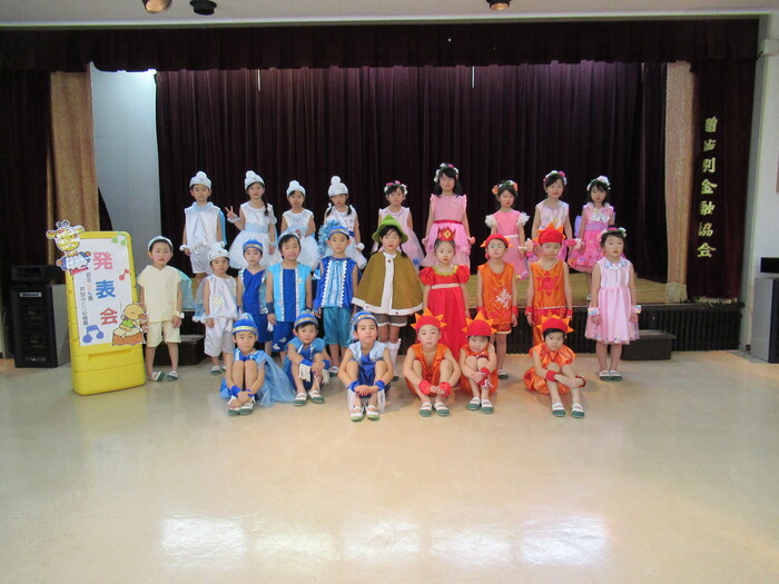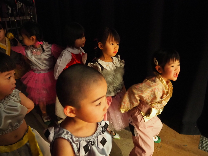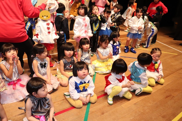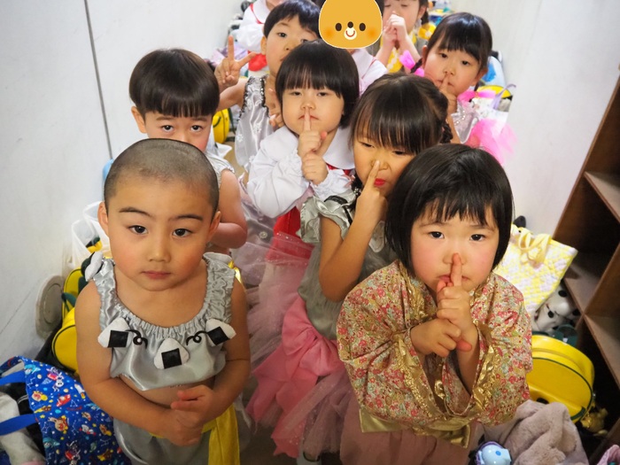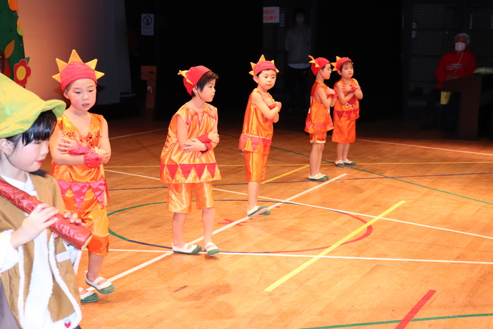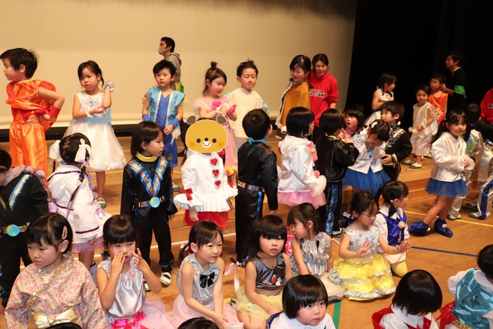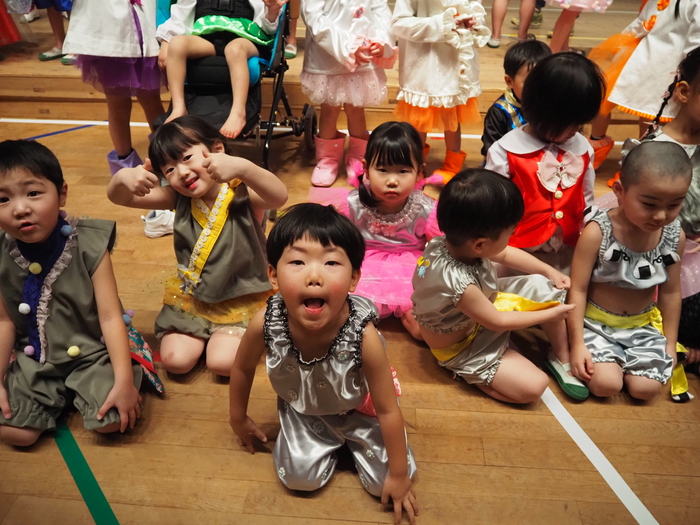 臨時休園があり、市民会館練習がいつもより少ない中で発表会を迎えました。当日は、運動会に引き続き〝欠席者ゼロ〟で発表会を開催できたこと、とても嬉しく思います。たくさんのお客さんの前で、緊張している姿や気持ちが高ぶっている姿、お家の人を探している姿も見られましたが、総練習の時よりも力強く、一所懸命に発表する子ども達の姿が見られました。控室では、手作り衣装に着替えると、嬉しそうに出番を待っていた子ども達。発表後には、満足そうな笑顔があちらこちらで見られました。保護者のみなさま、当日はたくさんのご来場と温かな拍手をいただき、本当にありがとうございました。 | ||