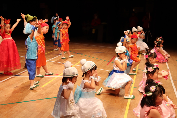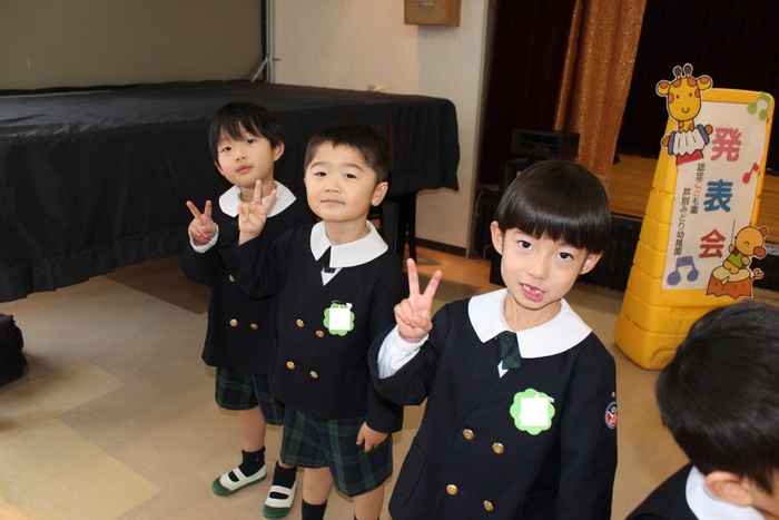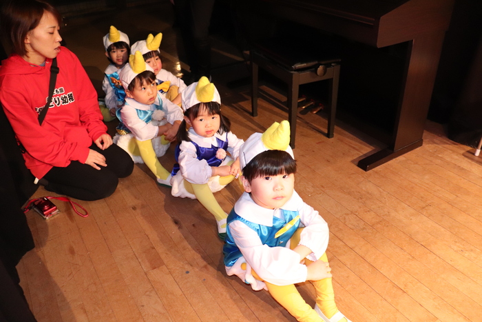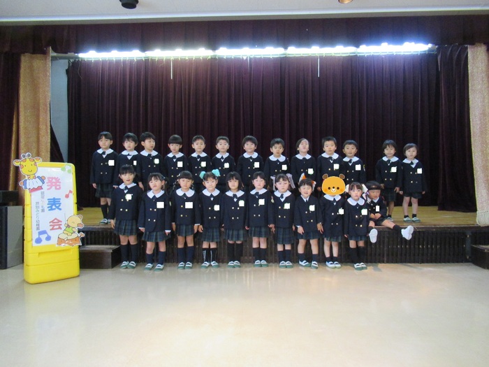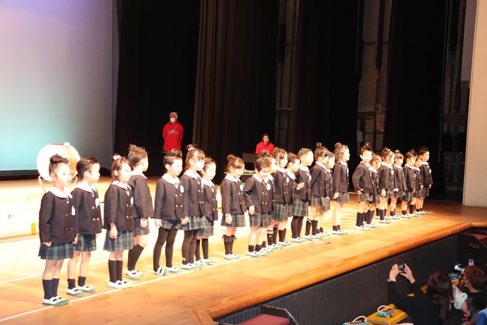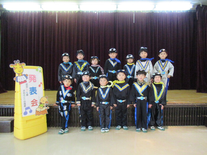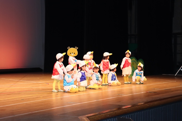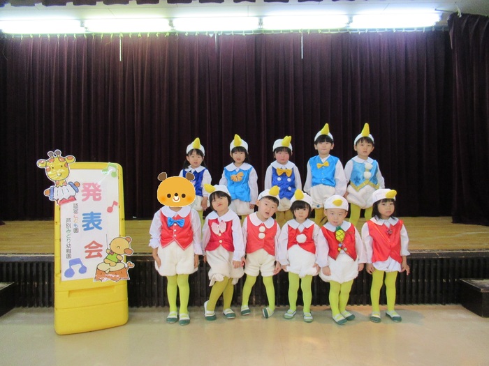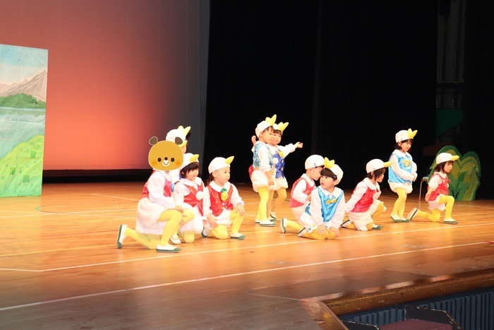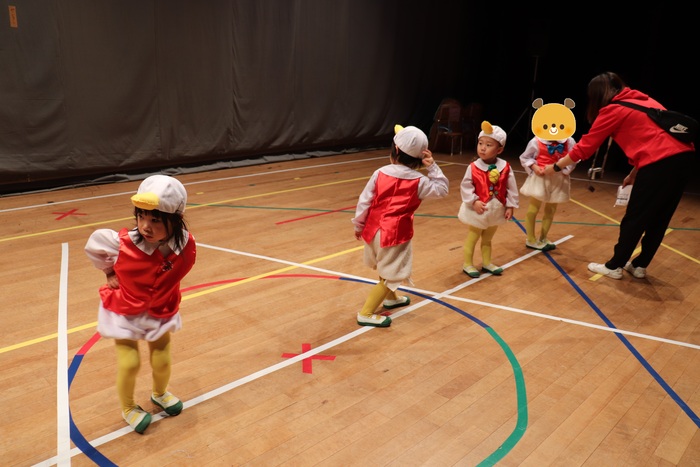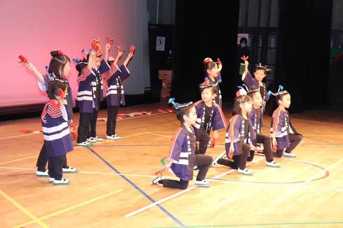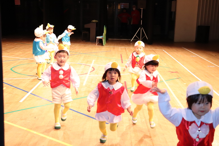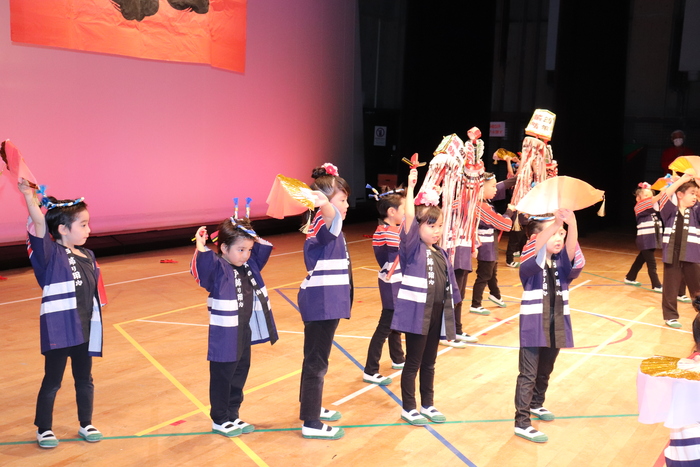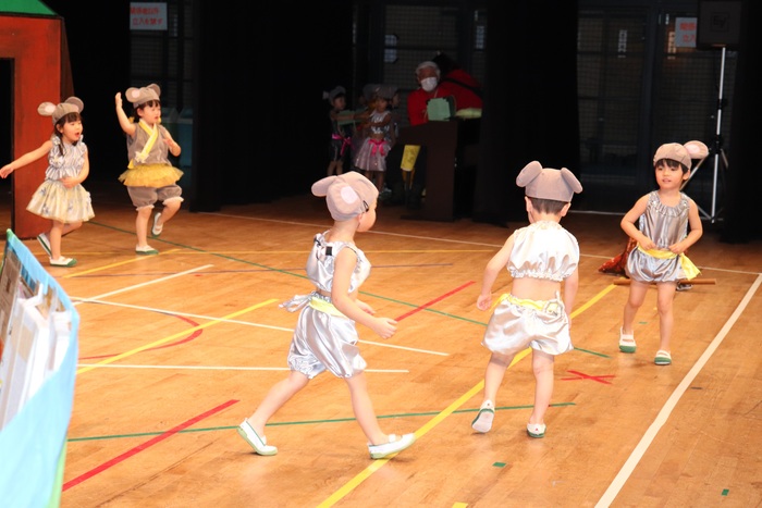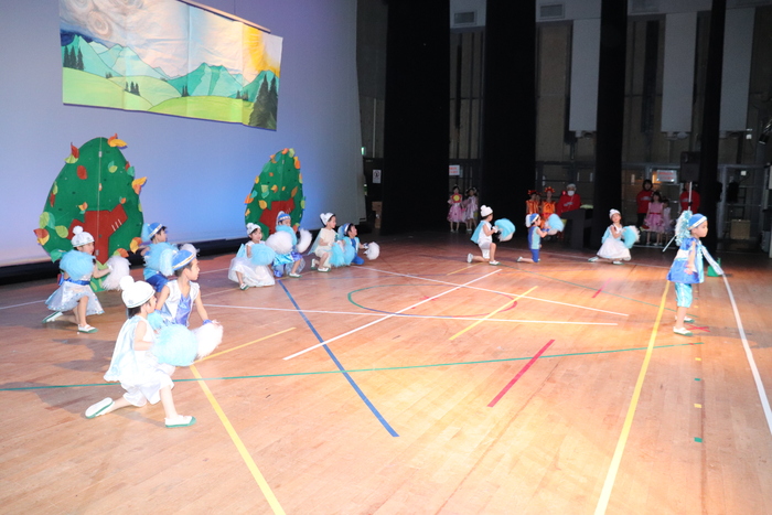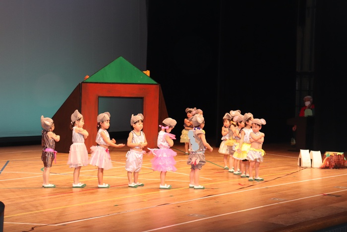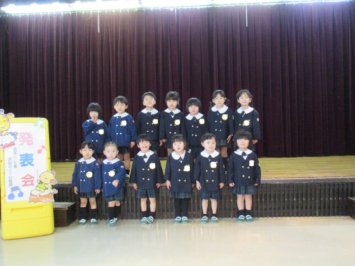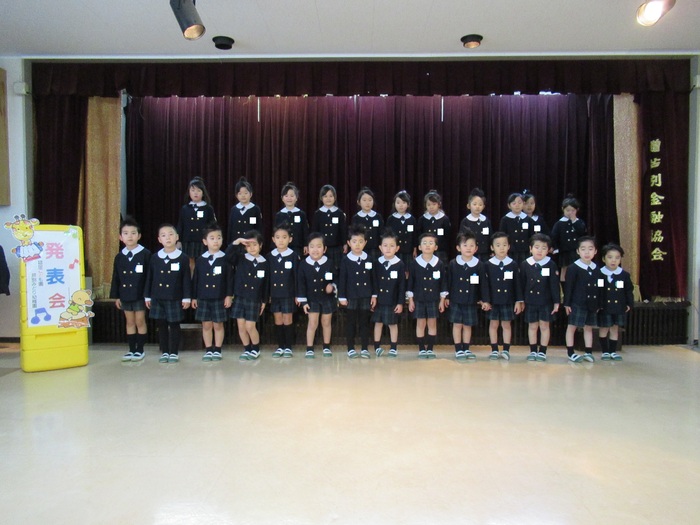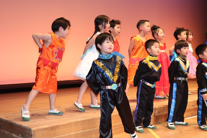 臨時休園があり、市民会館練習がいつもより少ない中で発表会を迎えました。当日は、運動会に引き続き〝欠席者ゼロ〟で発表会を開催できたこと、とても嬉しく思います。たくさんのお客さんの前で、緊張している姿や気持ちが高ぶっている姿、お家の人を探している姿も見られましたが、総練習の時よりも力強く、一所懸命に発表する子ども達の姿が見られました。控室では、手作り衣装に着替えると、嬉しそうに出番を待っていた子ども達。発表後には、満足そうな笑顔があちらこちらで見られました。保護者のみなさま、当日はたくさんのご来場と温かな拍手をいただき、本当にありがとうございました。 | ||