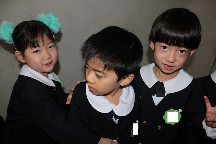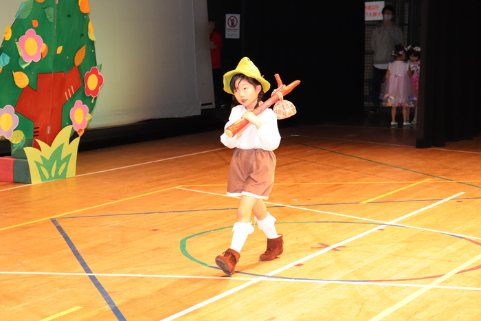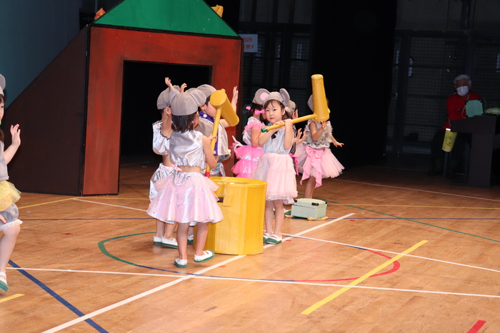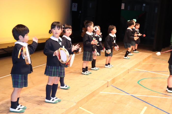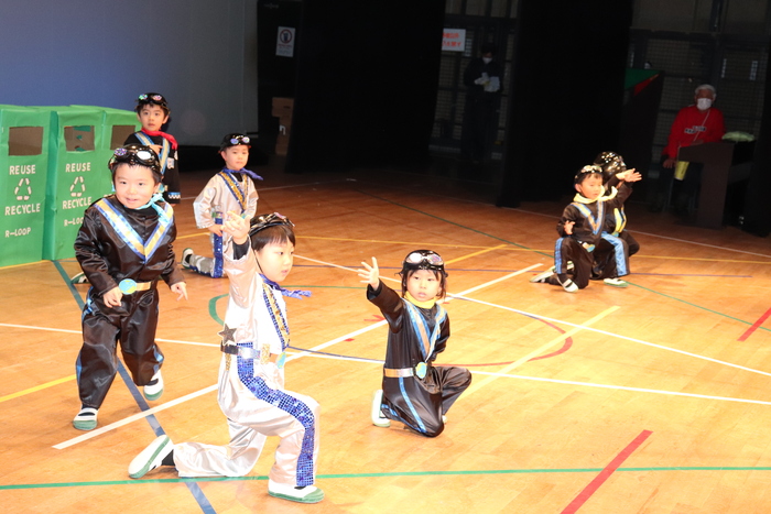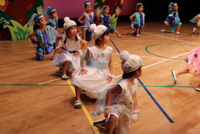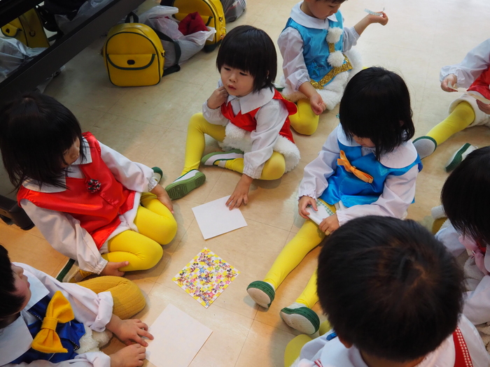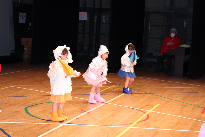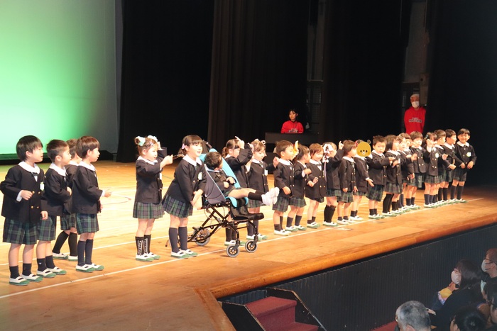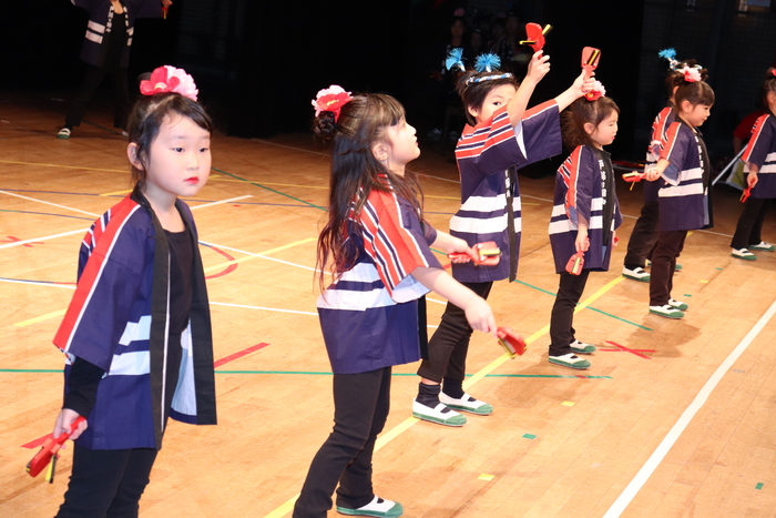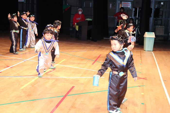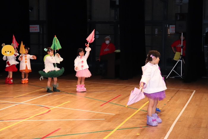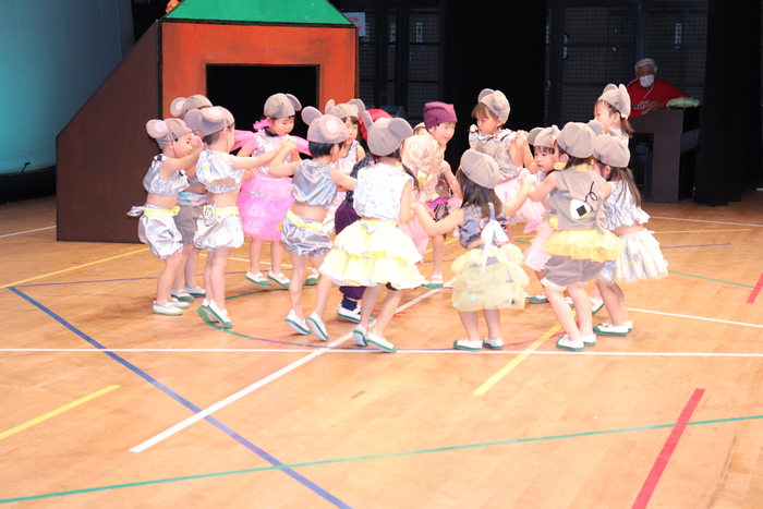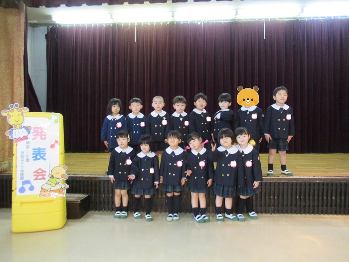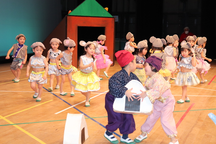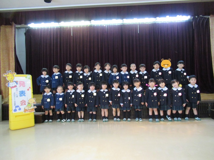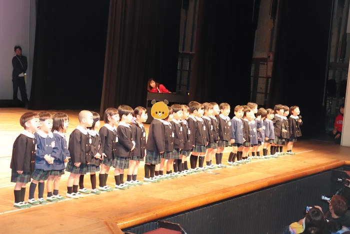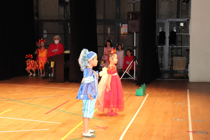 臨時休園があり、市民会館練習がいつもより少ない中で発表会を迎えました。当日は、運動会に引き続き〝欠席者ゼロ〟で発表会を開催できたこと、とても嬉しく思います。たくさんのお客さんの前で、緊張している姿や気持ちが高ぶっている姿、お家の人を探している姿も見られましたが、総練習の時よりも力強く、一所懸命に発表する子ども達の姿が見られました。控室では、手作り衣装に着替えると、嬉しそうに出番を待っていた子ども達。発表後には、満足そうな笑顔があちらこちらで見られました。保護者のみなさま、当日はたくさんのご来場と温かな拍手をいただき、本当にありがとうございました。 | ||