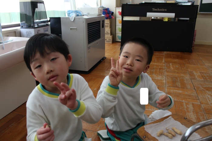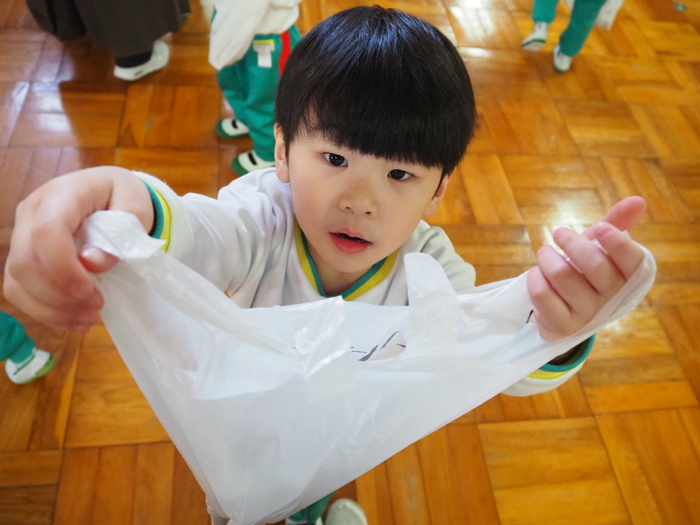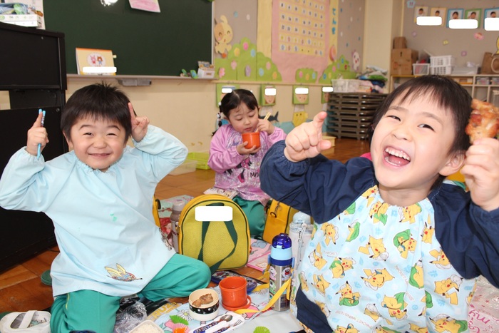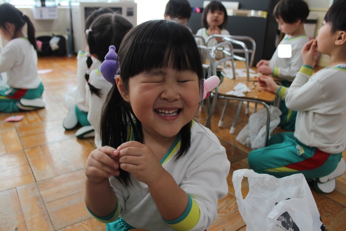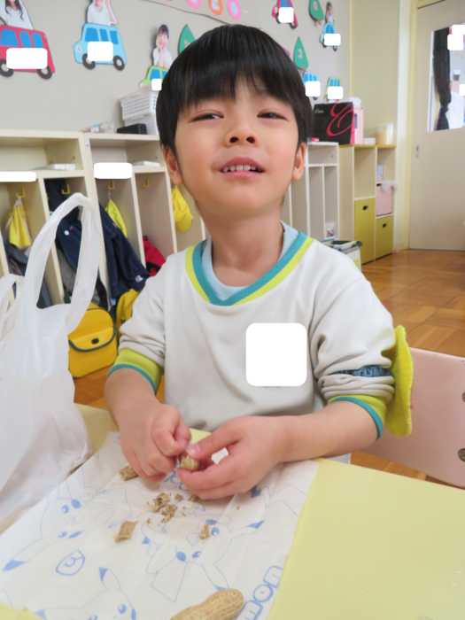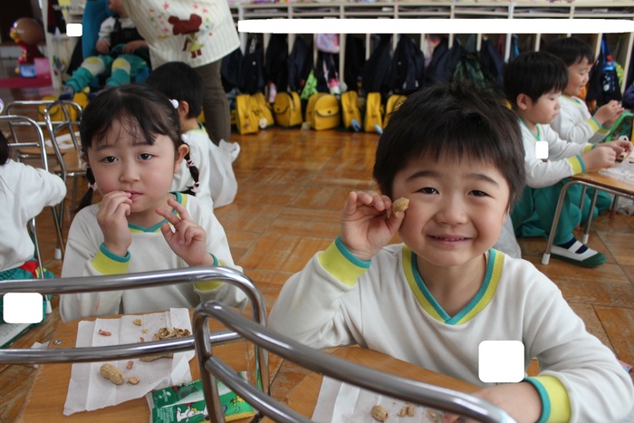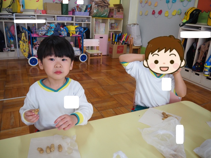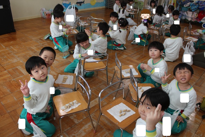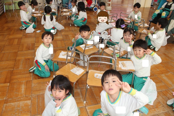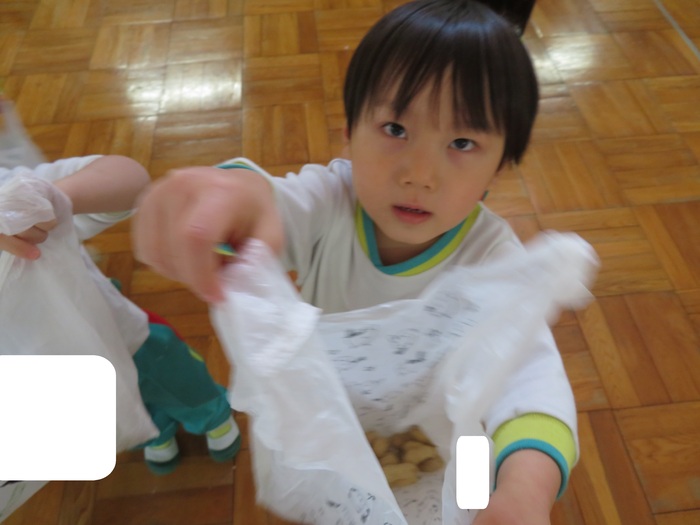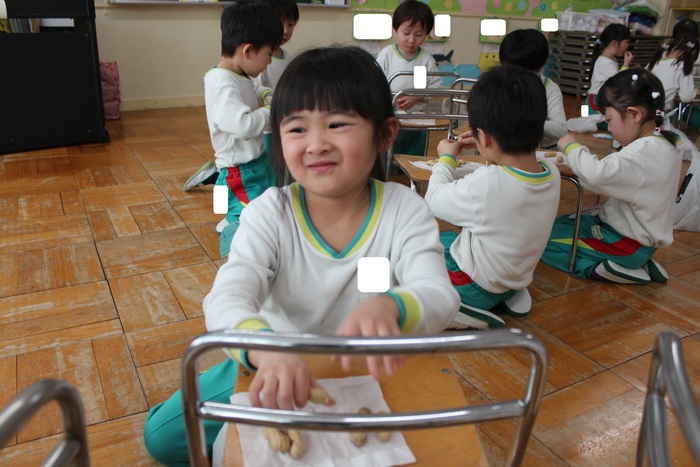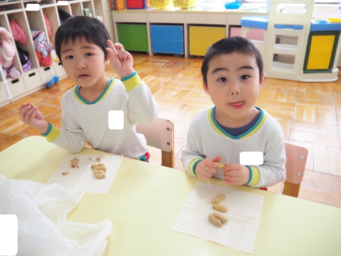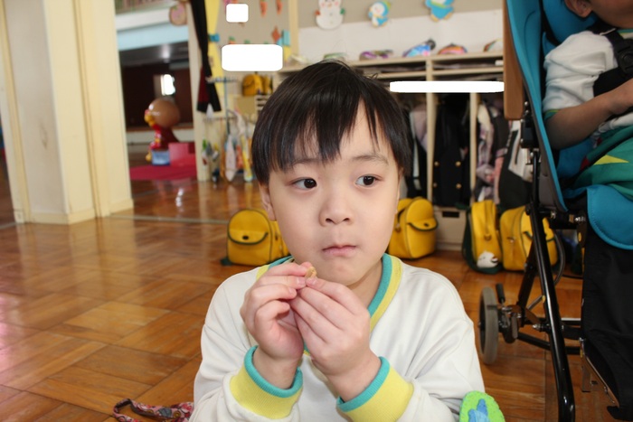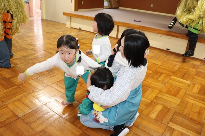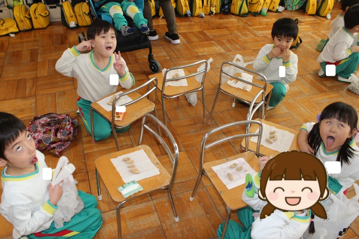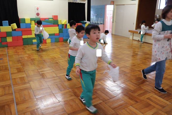 2月3日(火)節分、園でも〝豆まき会〟を行いました。『みんなが健康で幸せに過ごせますように…』という意味を込め、邪気払いとして『鬼は外、福は内』と言いながら豆まきを行う伝統行事。自分たちで作成した鬼のお面を付け『鬼が来たら、やっつけるぞ!』と楽しみにしていた子ども達。当日は、ホールに集まり〝節分〟についてのお話を聞き、♬豆まきの歌♪を歌っていると、鬼がどこからか出てくるのでは…と子ども達はドキドキ、ソワソワ(-_-;)。すると…掛け声とともに赤鬼が登場!! 怖くて泣きだしてしまう子や先生にしがみつく子、必死に逃げ回る子など等…。しかし、園長先生が豆を投げて退治しようとした瞬間にカゴに入っていた豆をすごいスピードで取りに来て『鬼は外、福は内!』と必死に鬼へめがけてまいていました。子ども達の勢いに負け、鬼が弱って退散していくとホッと安心した子ども達でした。 その後は、学年ごとに福の神の園長先生がまいた豆を拾って『豆まき』を楽しみました。給食時には、金棒チキンを子ども達は喜んで食べていました。鬼は、怖かったけれど子ども達は怖さに負けず頑張って〝鬼〟に立ち向かい、季節の行事を楽しみました。 | ||
