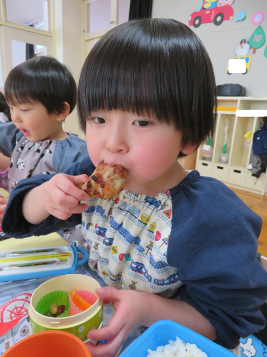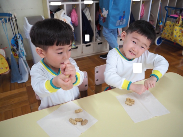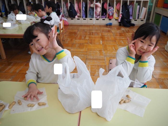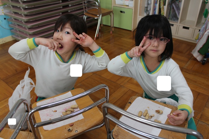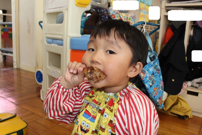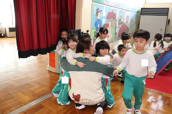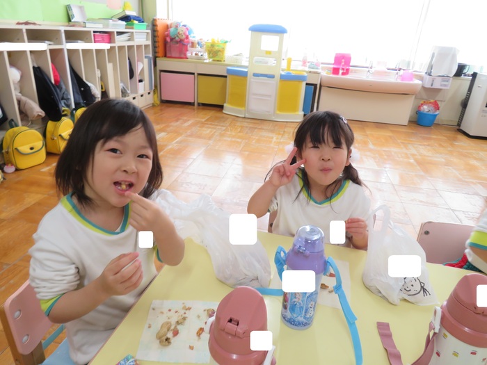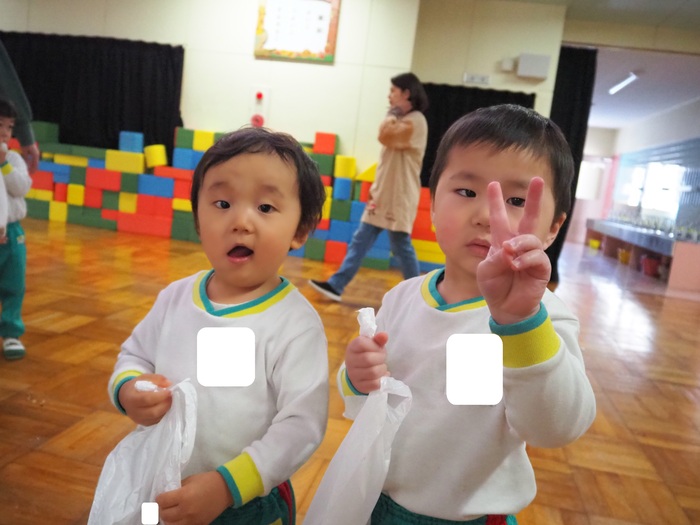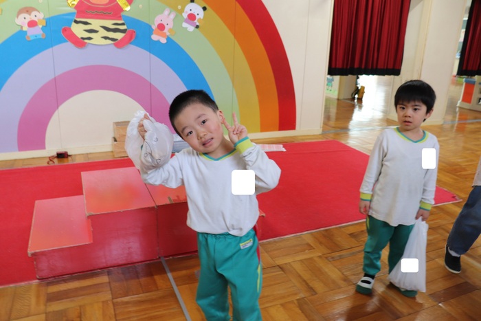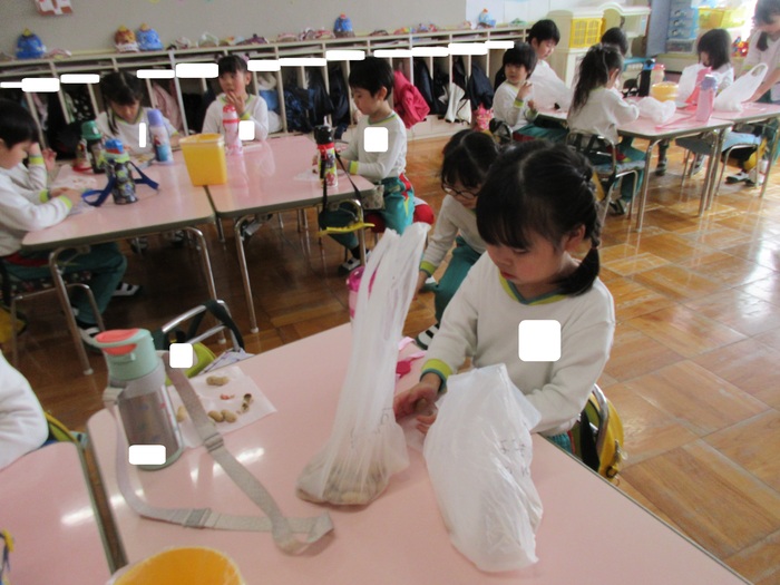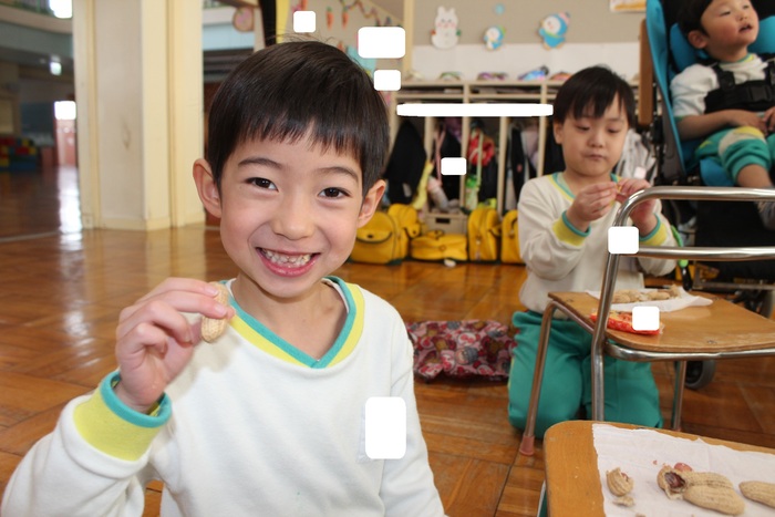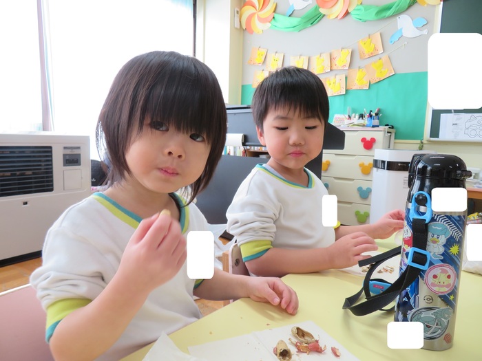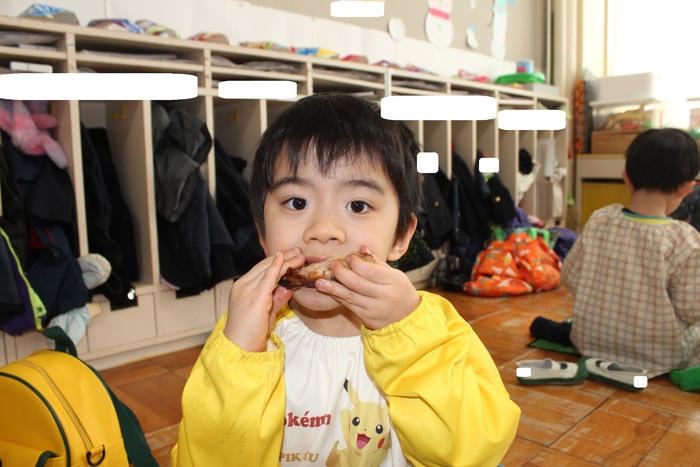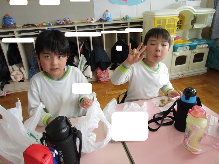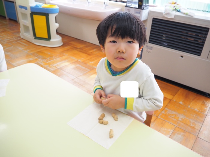 2月3日(火)節分、園でも〝豆まき会〟を行いました。『みんなが健康で幸せに過ごせますように…』という意味を込め、邪気払いとして『鬼は外、福は内』と言いながら豆まきを行う伝統行事。自分たちで作成した鬼のお面を付け『鬼が来たら、やっつけるぞ!』と楽しみにしていた子ども達。当日は、ホールに集まり〝節分〟についてのお話を聞き、♬豆まきの歌♪を歌っていると、鬼がどこからか出てくるのでは…と子ども達はドキドキ、ソワソワ(-_-;)。すると…掛け声とともに赤鬼が登場!! 怖くて泣きだしてしまう子や先生にしがみつく子、必死に逃げ回る子など等…。しかし、園長先生が豆を投げて退治しようとした瞬間にカゴに入っていた豆をすごいスピードで取りに来て『鬼は外、福は内!』と必死に鬼へめがけてまいていました。子ども達の勢いに負け、鬼が弱って退散していくとホッと安心した子ども達でした。 その後は、学年ごとに福の神の園長先生がまいた豆を拾って『豆まき』を楽しみました。給食時には、金棒チキンを子ども達は喜んで食べていました。鬼は、怖かったけれど子ども達は怖さに負けず頑張って〝鬼〟に立ち向かい、季節の行事を楽しみました。 | ||