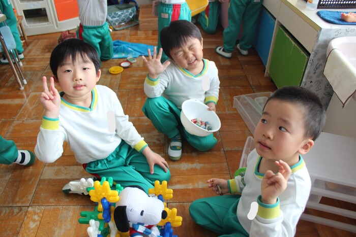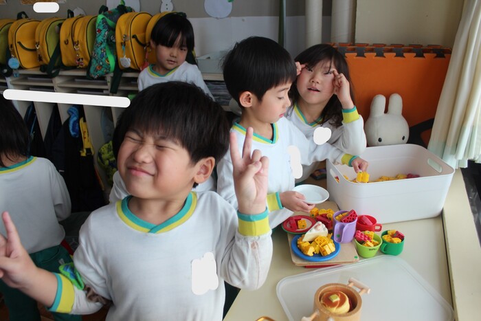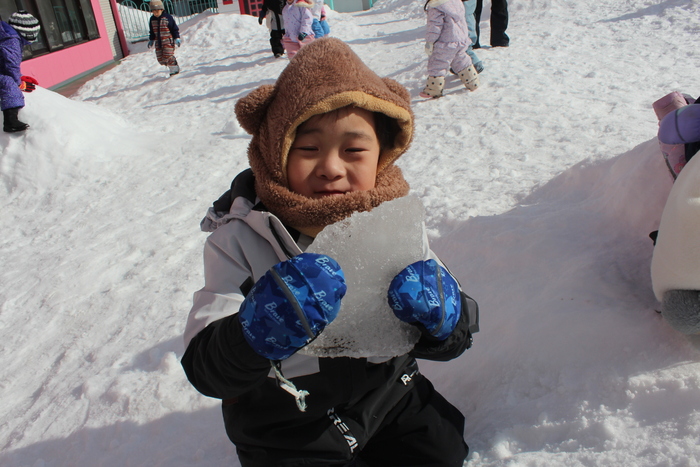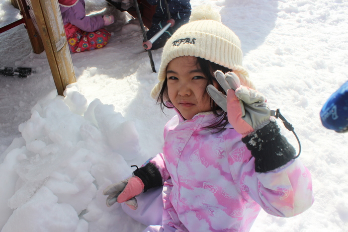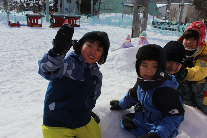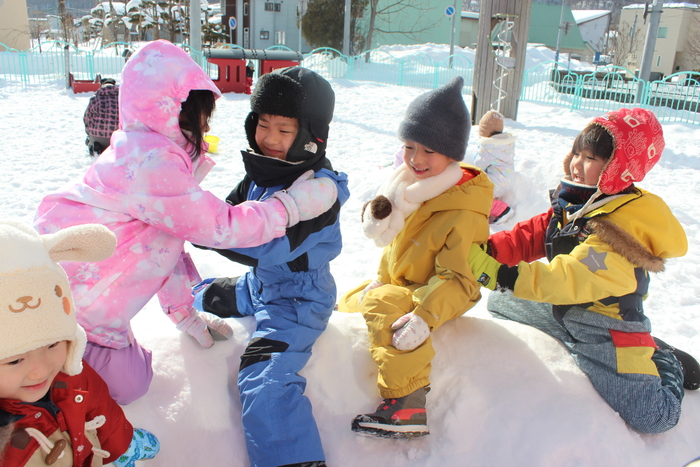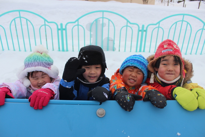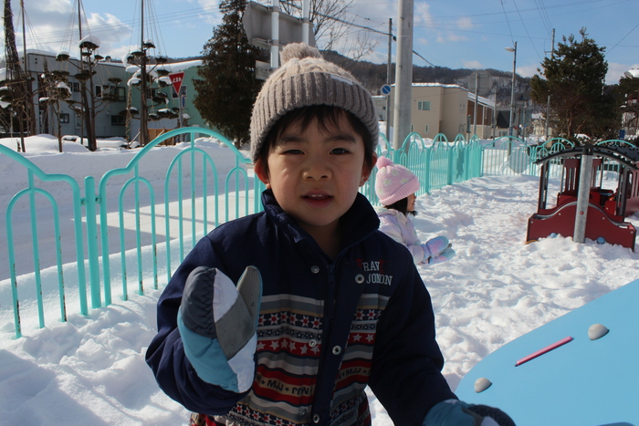日常の子ども達第4弾はすずらん組 すずらん組の子ども達は、毎日元気いっぱいに遊んでいます。最近はカメラを向けると可愛らしいポーズや面白い顔をしてくれる子などとてもユーモアに溢れています。 冬ならではの雪遊びでは寒さに負けず、小山の頂点を目指して取り合いをしたり、雪玉を作ったりと夢中になって遊んでいます。友達と声をかけ合いながら遊ぶ姿も見られ冬ならではの遊びを満喫してます! また、お店やさんごっこの準備にも意欲的に取り組んでいます。「もっとやりたい」と楽しみながら製作を進め 自分達で【こうしたら可愛くなるよね】とアイディアを出し合う姿も見られます。これからも子ども達の発想を大切にしながら活動を広げていきたいと思います | ||