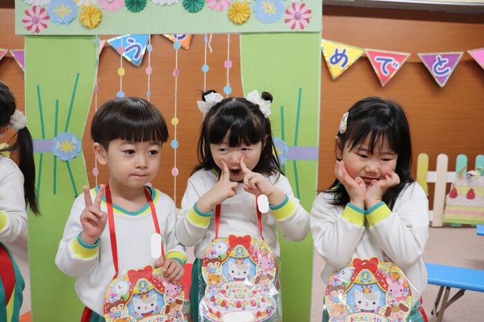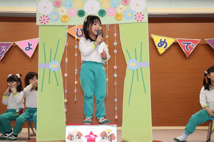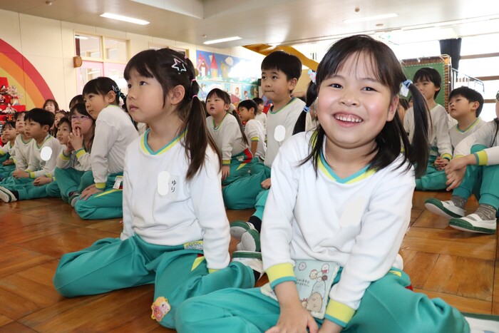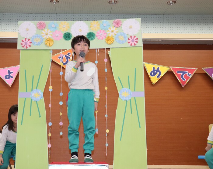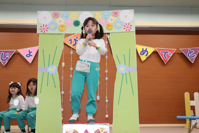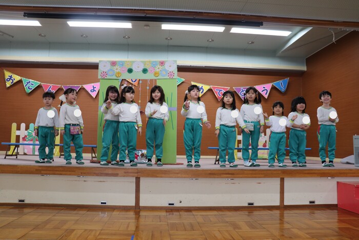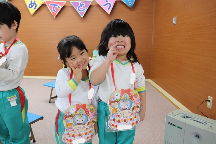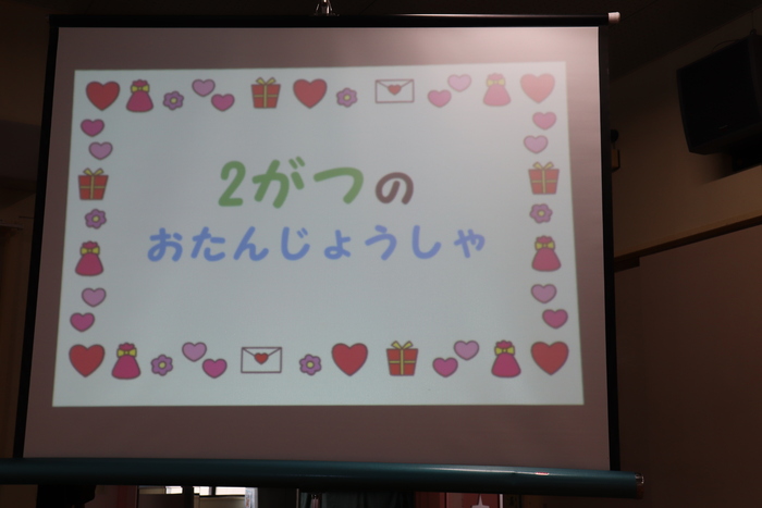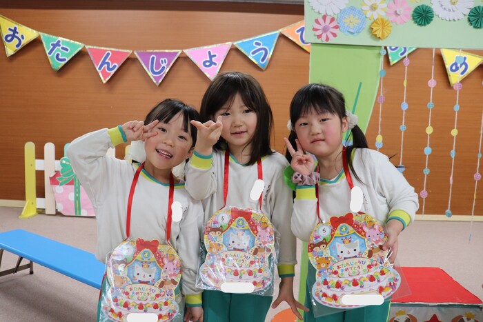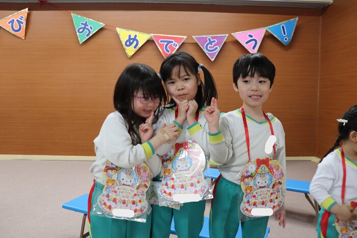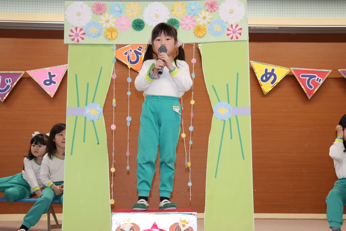 2月生まれのお誕生日会を行いました。 誕生者のお友達は少し緊張した表情で入場しましたが、いざ発表の時間になると、ドキドキしながらも一生懸命お話する姿や、ハキハキと元気よく発表する姿が見られました。「大きくなったらプリキュアになりたい」「プリンセスになりたい」などと素敵な夢も聞かせてくれました。 お楽しみは【おむすびころりん】の出し物!転がるおむすびに子ども達は大笑い。最後まで笑顔いっぱいの楽しい時間となりました! | ||