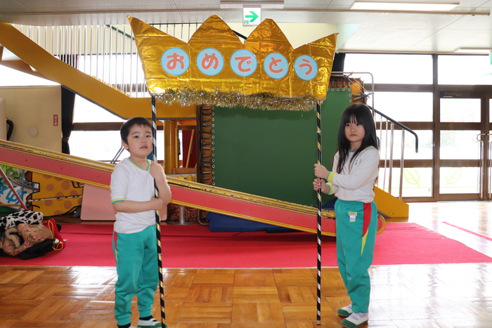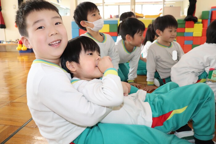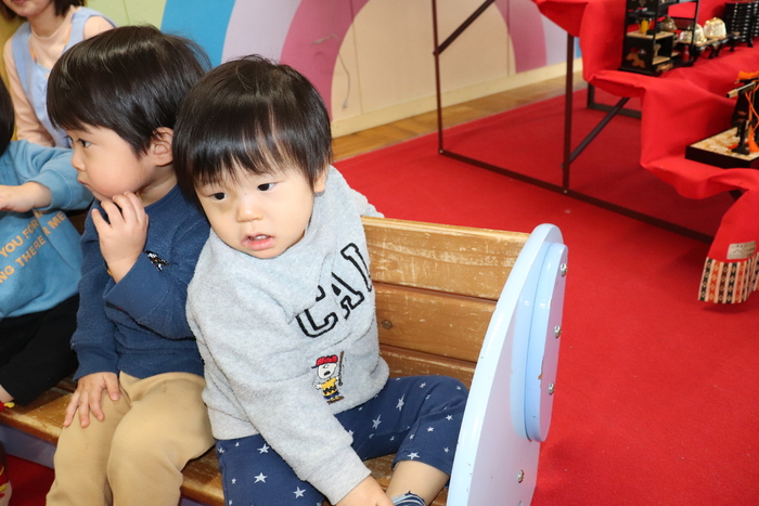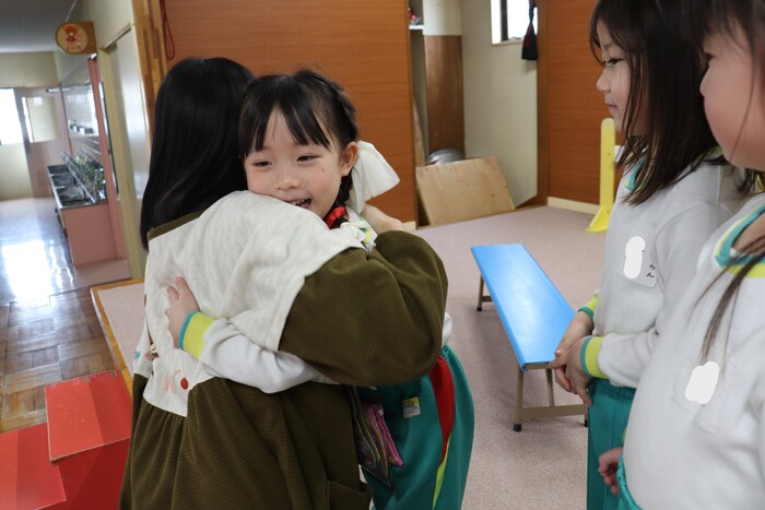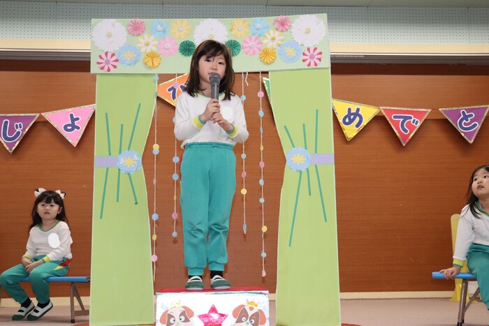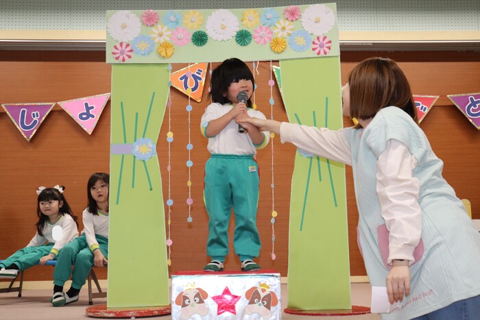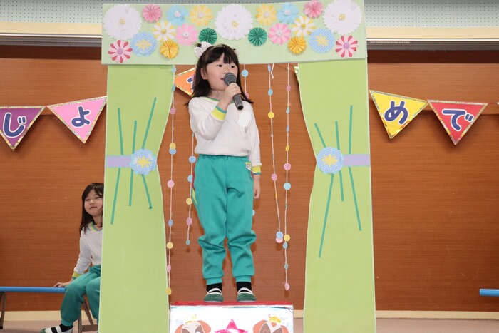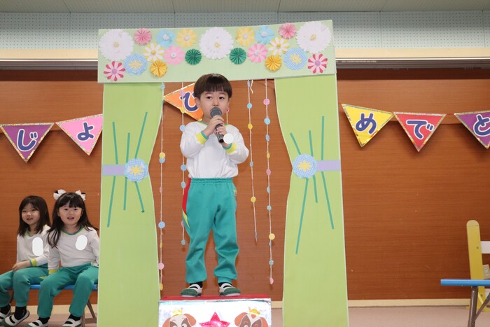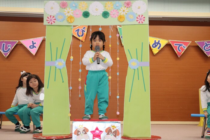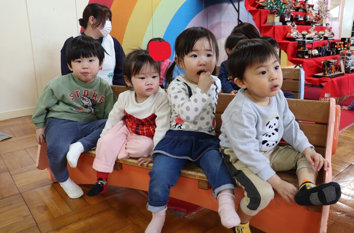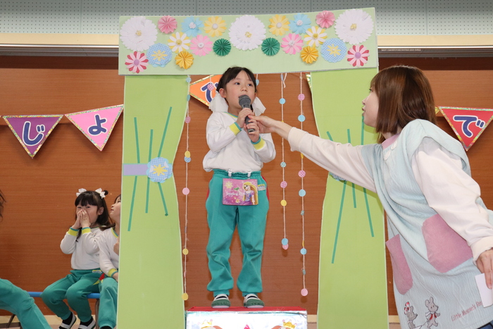 2月生まれのお誕生日会を行いました。 誕生者のお友達は少し緊張した表情で入場しましたが、いざ発表の時間になると、ドキドキしながらも一生懸命お話する姿や、ハキハキと元気よく発表する姿が見られました。「大きくなったらプリキュアになりたい」「プリンセスになりたい」などと素敵な夢も聞かせてくれました。 お楽しみは【おむすびころりん】の出し物!転がるおむすびに子ども達は大笑い。最後まで笑顔いっぱいの楽しい時間となりました! | ||