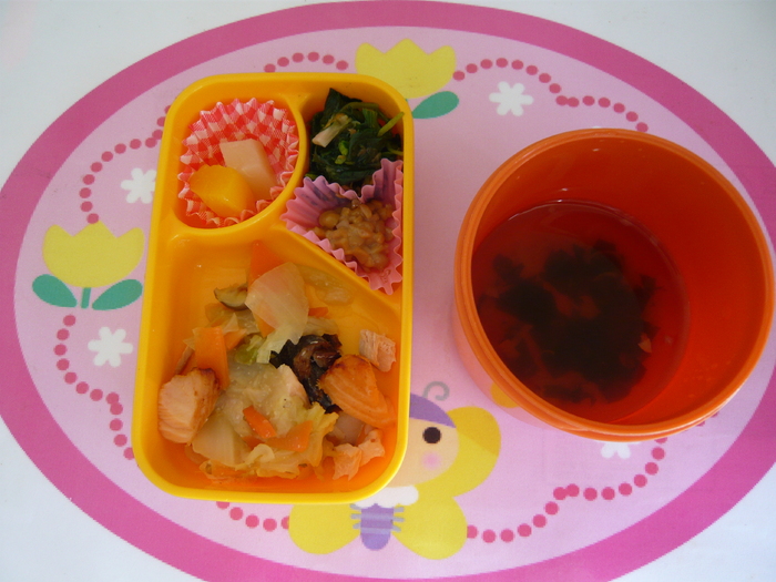 令和8年 3月9日(月) ★ ちゃんちゃん焼き ★ ほうれん草のお浸し ★ 納豆 ★ すまし汁 ★ もも缶 | ||