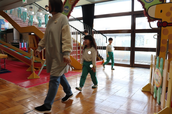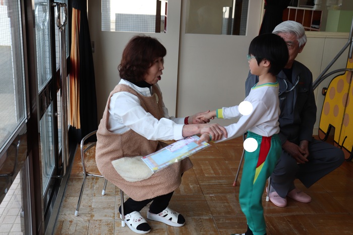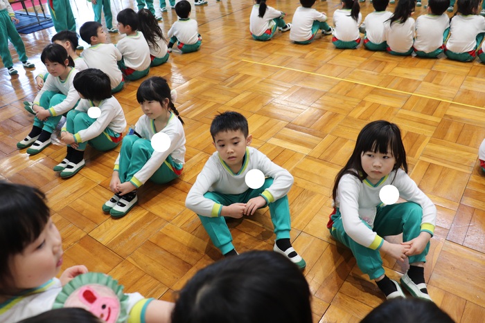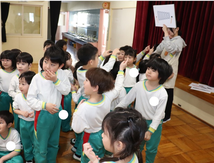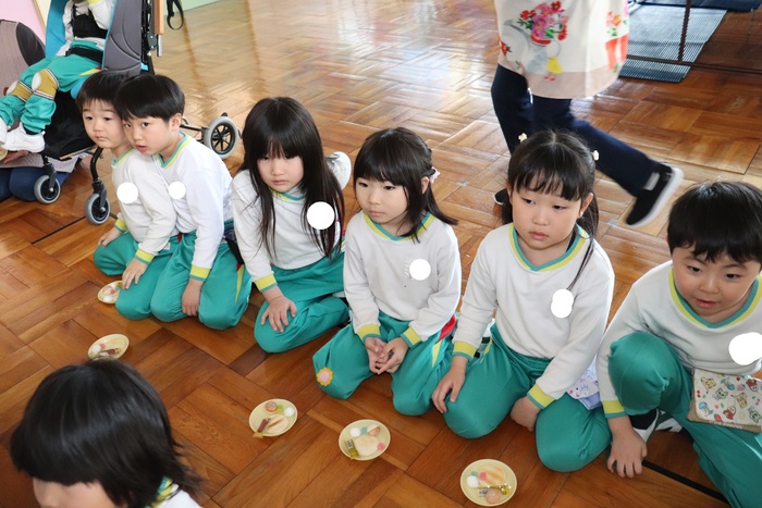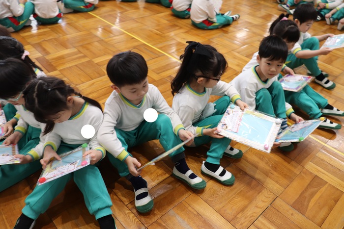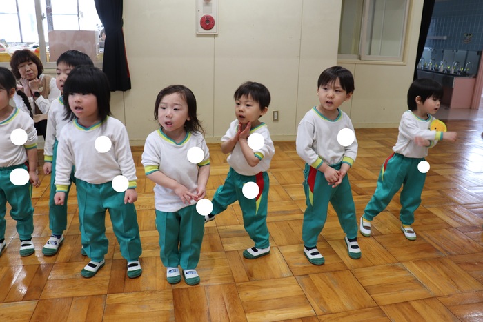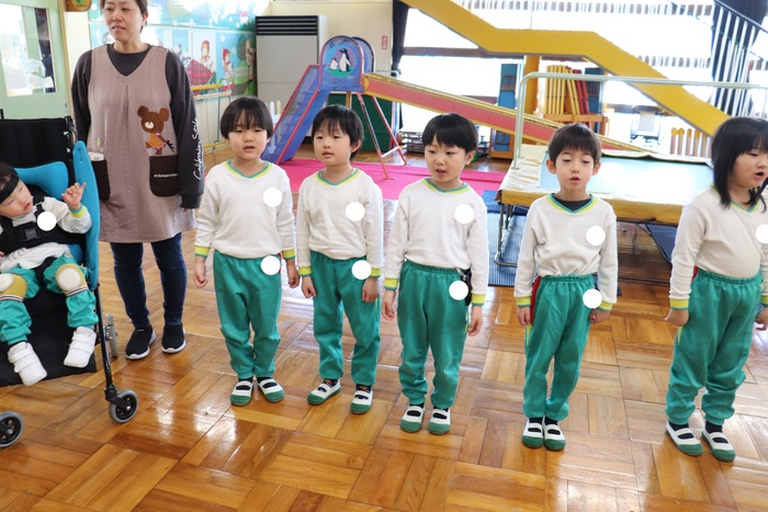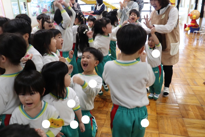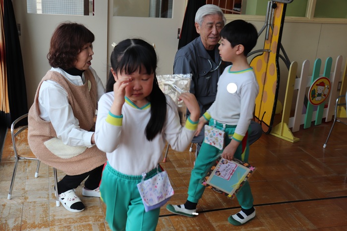 卒園を迎える25名の年長さんのお別れ会をしました。 2択の音当てクイズや思い出の写真を振り返りながら、おかしなところを探したりと盛り上がった会でした。 最後に、年中・年少・満三歳児からの歌と言葉、ホワイトボードのプレゼント。 年長さんからも歌と言葉のお礼をもらいました。 | ||