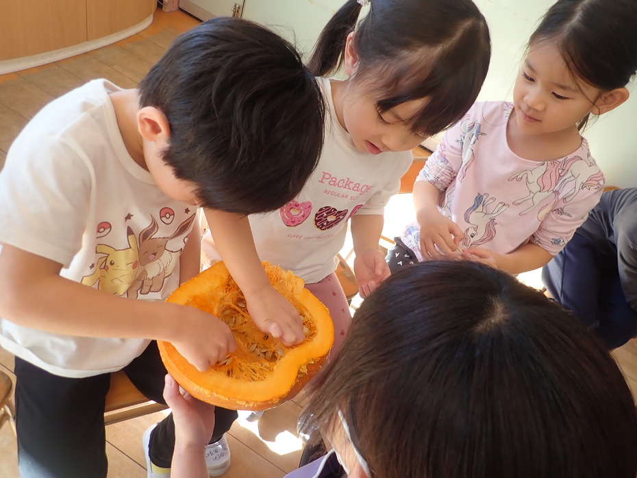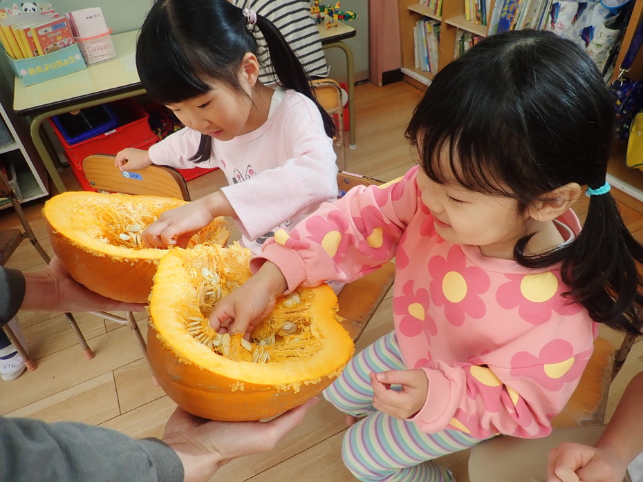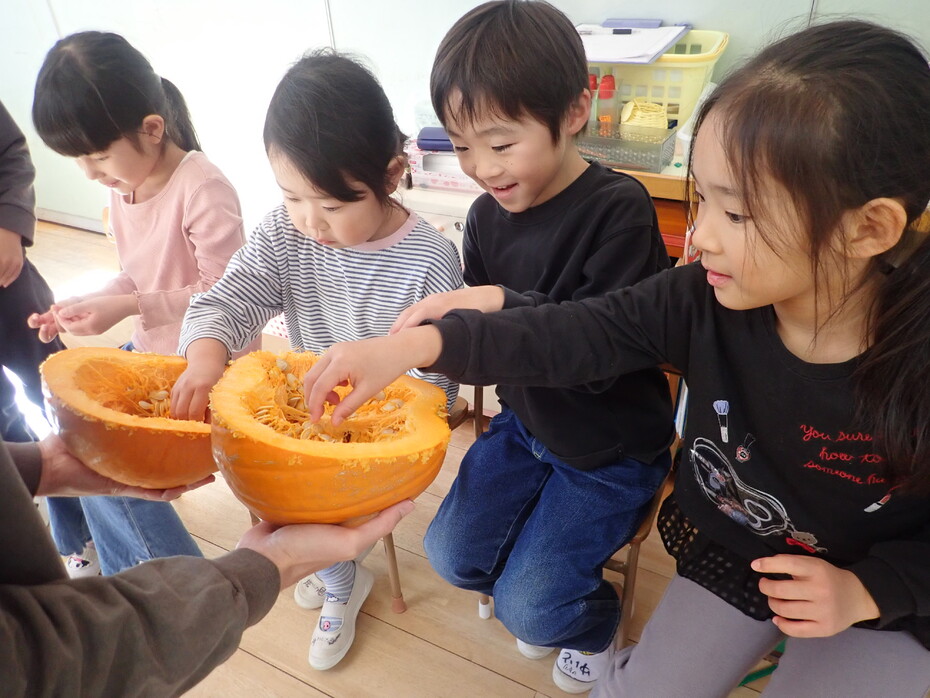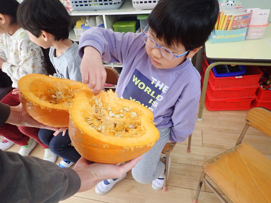 おおきなかぼちゃ。中身はいったいどうなっているのだろう・・。興味津々で触ってみる子どもたちの姿は、目が輝き、驚きの声をあげていました。