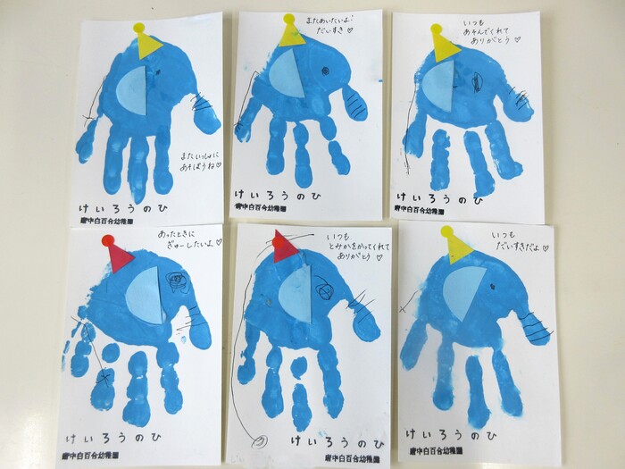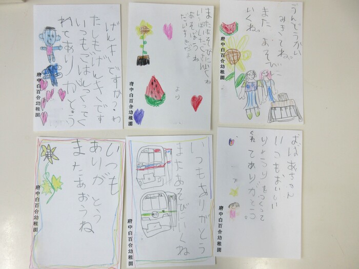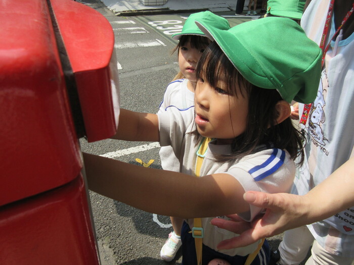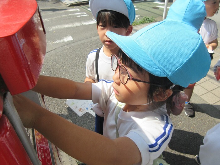 敬老の日までに届きますように・・・。いつも、優しい大好きなおじいさんおばあさんに感謝の気持ちを込めて、子ども達がお手紙を書きました。そして、代表して年長さんが近くの郵便ポストに投函しに行ってくれました。 幼稚園でもおじいさんおばあさんとの楽しいお話をよく聞かせてくれる子ども達。これからも、どうぞお元気でお過ごしください。 | ||