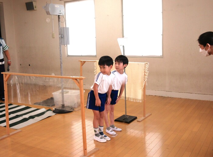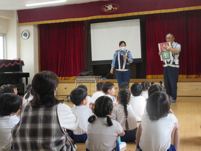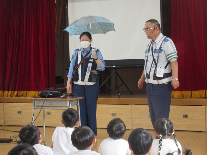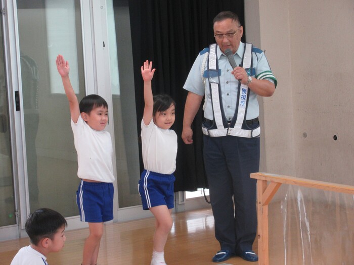 年長さんの交通安全指導教室を行いました。4月になったら小学生になる子ども達に、警察官から道路の歩き方や傘の持ち方など、交通安全に関することを詳しく教えていただきました。DVDを見たり、実際に周囲に気を配りながら横断歩道を渡る練習もしました。 | ||