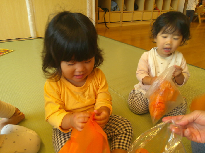 新聞紙をびりびり、ひらひら~!