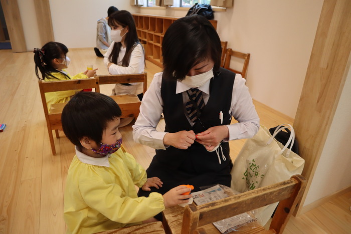 つぎは、お椅子を移動して お父さん・お母さんと 一緒に製作です💗 子ども達は隣に居れるだけで にこにこ笑顔で嬉しそうです😊 | ||
