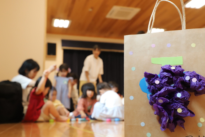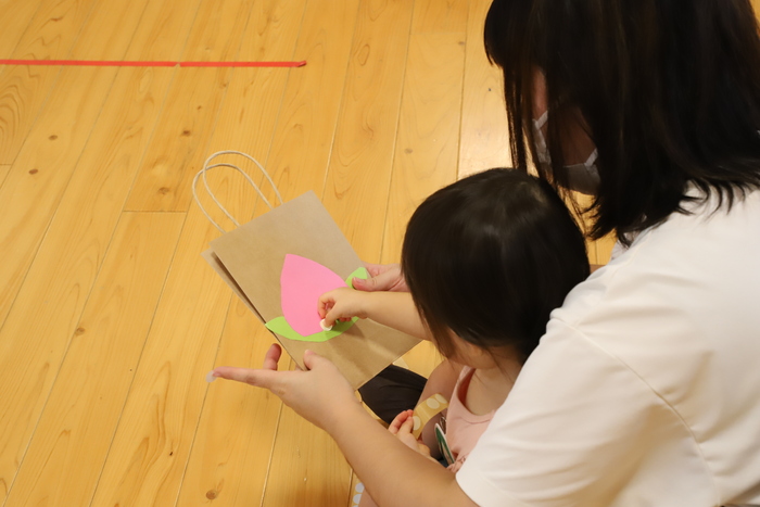 まずは、フルーツの 絵がついた紙ぶくろに いろんな色のシールを貼ったり はながみを丸めて貼ったり… あっという間にかわいい くだものかごができました🍏
