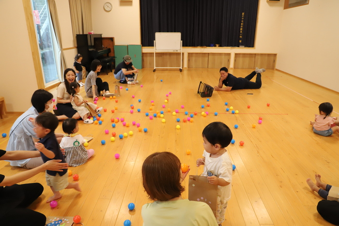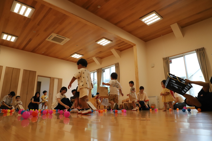 そのあとは、 カラーボールをつかった “くだものあつめゲーム”!🍎 「よーい、どん!」の合図で、 ころころ転がるボールを 夢中で追いかける子どもたち❤️