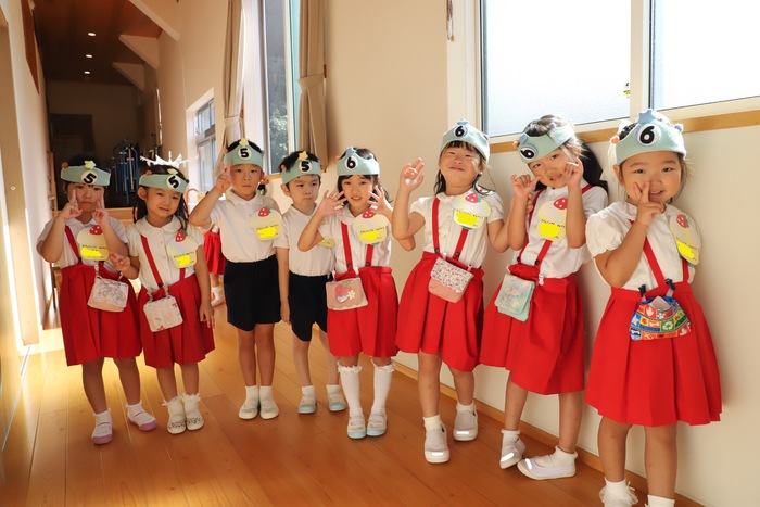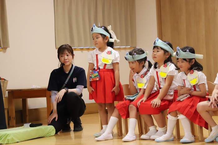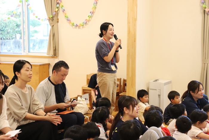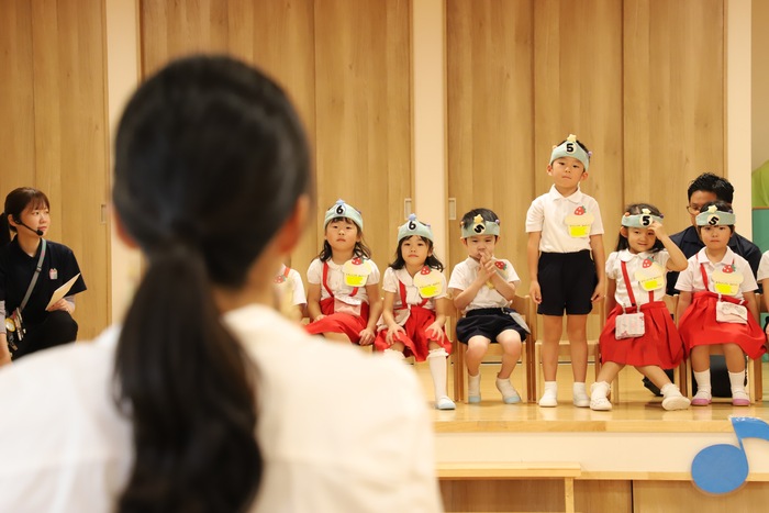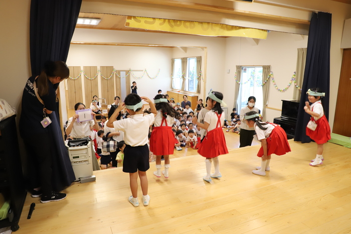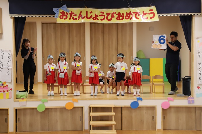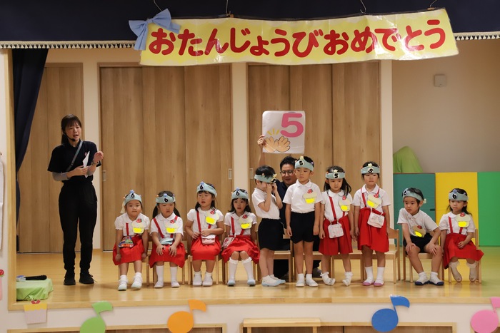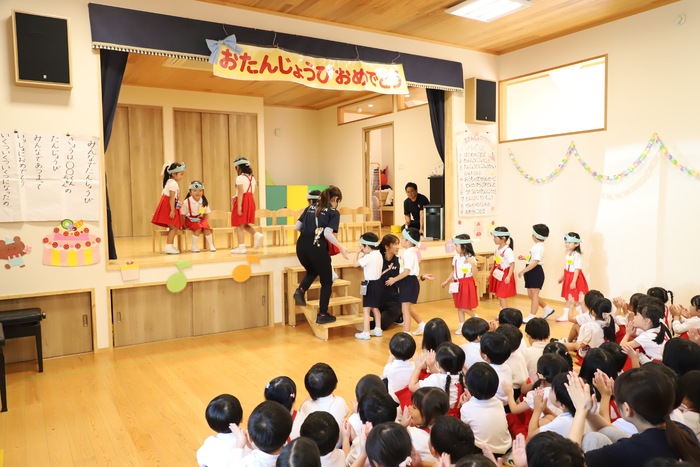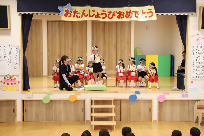 ホールに並んだ 子どもたちの服装から、 少しずつ秋の訪れを 感じました🍂 小さいうちの一年は、 本当に濃いですね。 できることがどんどん増えて、 毎日が新しい発見の連続です🌈 おうちの方からのメッセージは やっぱり胸がじんとして 涙が出てしまいそうになります💌 優しい言葉の一つひとつに、 子どもへの想いが たっぷり込められていました🧡 お誕生日おめでとうございます🎈 先生たちの出し物では、 幕のうしろに隠れた子が 順番に声を出して 自分の子どもの声か当てる クイズをしました🎤 お母さんたちは、 どの声が自分の子かを 真剣に当てっこ。 結果はなんと全員正解👏 前回の「手あてクイズ」に続き、 親子の絆を感じる 温かいひとときになりました🩵 以下は、その時の様子です🌱 | ||