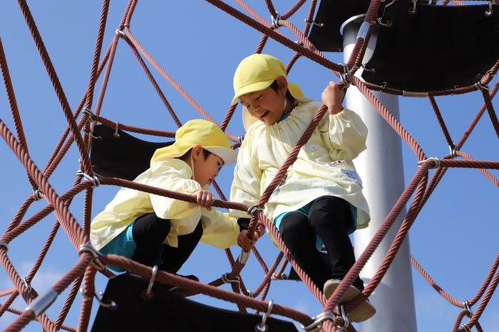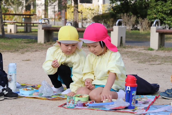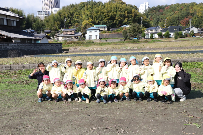 そら組さんは すごく暖かい天気の中 芋掘り遠足に 出かけました🍠 バスでは季節の歌の 焼きいもグーチーパーを 楽しんだり、 お芋で作りたい料理を 話をしたりしながら わくわくムードに🎶 朝はすこし寒く 上着を着こんでの スタートでしたが、 芋を掘りはじめると すぐに体も心も ぽかぽかになりましたよ🔥 太いツルを見つけて 力いっぱい引っぱる 姿がとても逞しく 見えました💪✨ 折れないように ゆっくり掘り進め、 きれいに抜けた瞬間は 「ぬけた!」と嬉しい声が 響いていました❤️ 葉っぱ集めや ツルあそびも 大人気でした😊 お昼のお弁当は どれも本当に おいしそうで、 先生たちも思わず 笑顔になりました🍱 食後は遊具や広場で 思いきり走り、 秋の風を感じる 遠足になりました🌈 | ||
