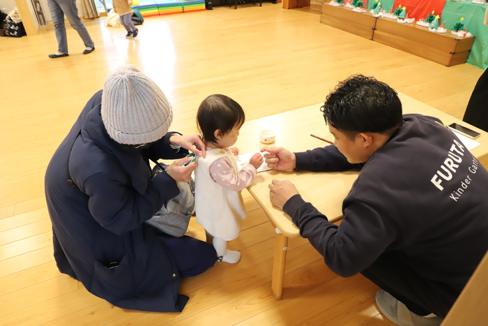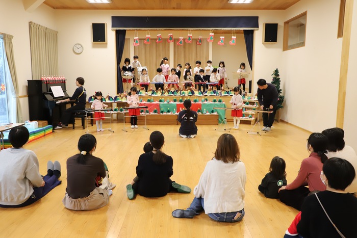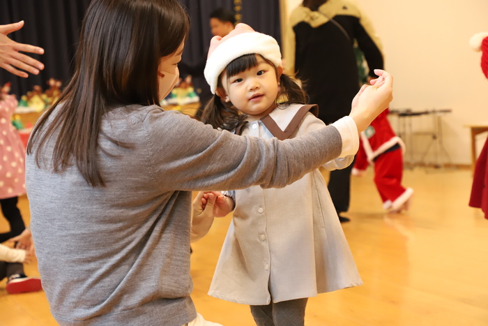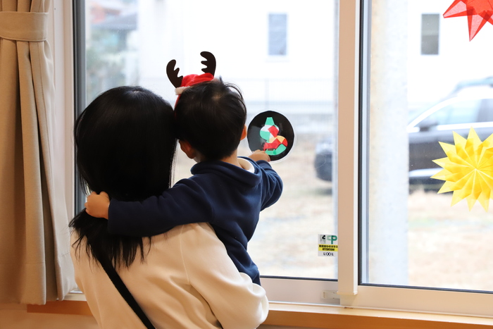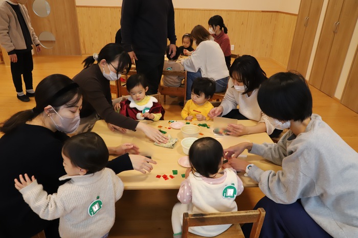 12月のふるふるくらぶは、 少し早めのクリスマス会を たくさんのお友だちとしました🎄 今回は黒い画用紙と カラーセロファンを使って、 ステンドグラス作りに 挑戦しましたよ✨ お家の方と一緒に、 「どんな色にしようかな?」と 楽しそうに相談しながら、 協力して作り上げる姿が とても印象的でした😊 また、クリスマスの プレゼントとして、 サンタさんからの 手作りリースも準備しました🎁 クリスマス当日の25日に、 サンタさんから プレゼントがもらえるように、 ぜひお家で飾ってくださいね🎅 そのほかにも、 年長児による合奏の披露や、 クリスマスソングに 合わせて踊る時間もあり、 会場は終始、あたたかな 雰囲気に包まれていました🎵 以下は、その時の様子です🌱 | ||
