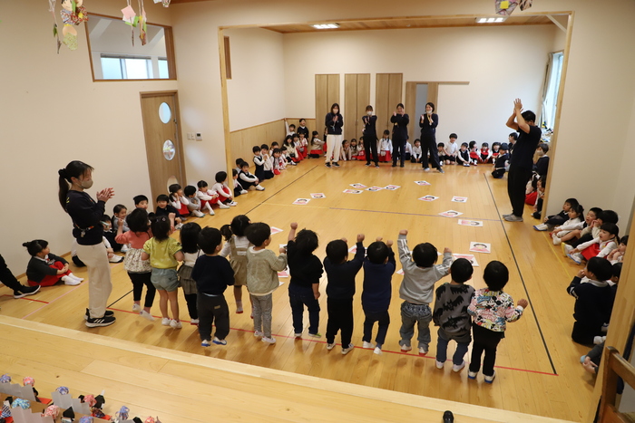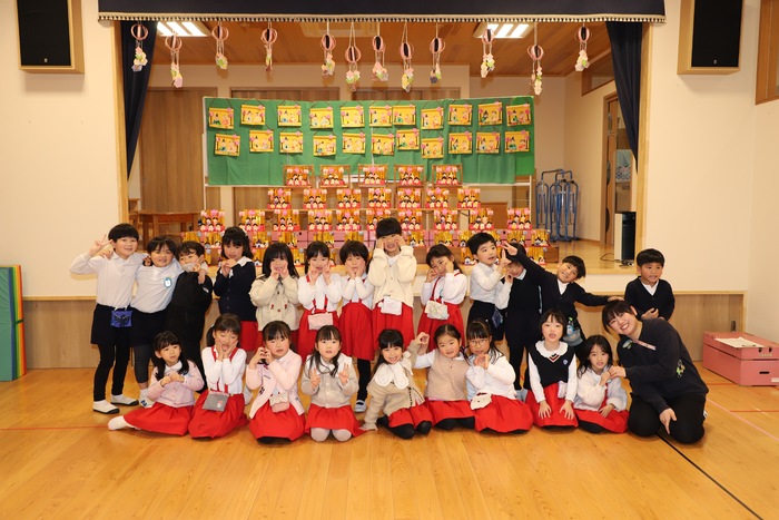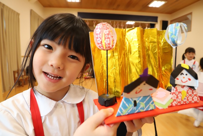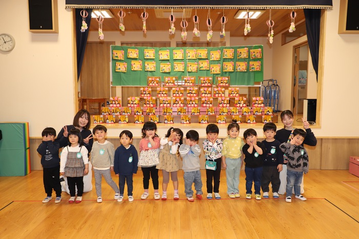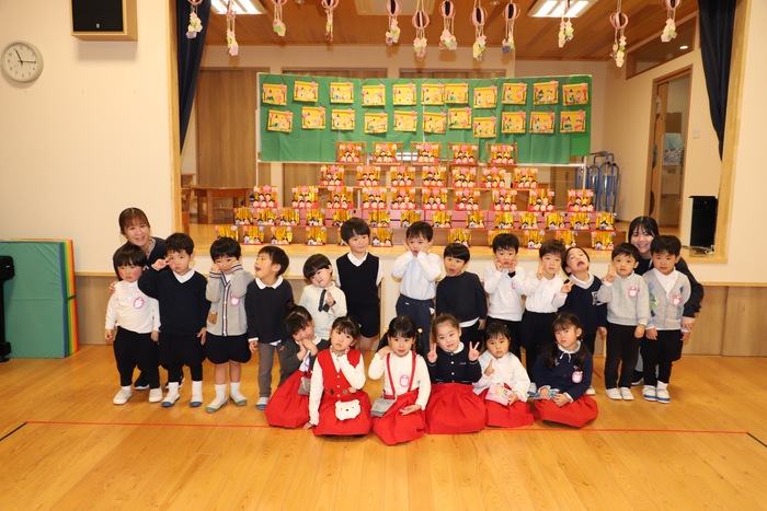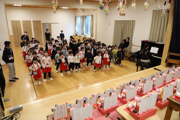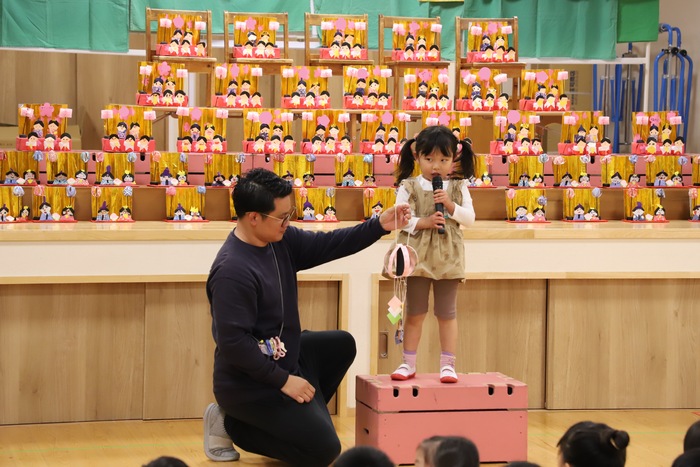 そして幕が開いた ホールのステージには、 子どもたちが作った ひな祭りの作品がずらりと並びました✨ それぞれの学年らしさがあふれ、 まるで本物の雛壇のような 迫力ある光景となりました🌸 一つひとつに 子どもたちの工夫や思いが込められていて、 選ばれた代表の園児がその作品の 頑張って作ったところや見どころを 丁寧に紹介してくれましたよ😊