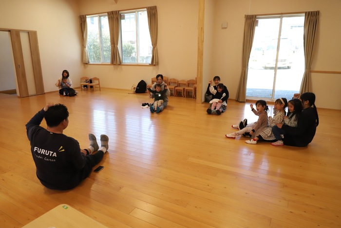 またホールでは、 バスに乗る練習として おうちの方の膝の上で 「バスに乗って」の リズム体操を楽しんだり、 マットをバスに見立てて ホール内をお散歩したりと、 様々な形でバス体験を味わいました🎵 以下は、その時の様子です🌱 | ||