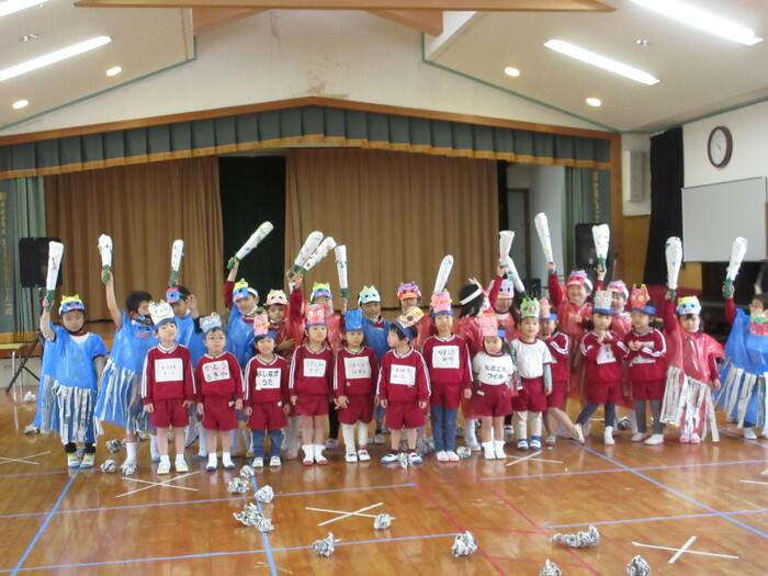2月3日節分の日、年長さんが鬼になってくれて豆まきをしました。