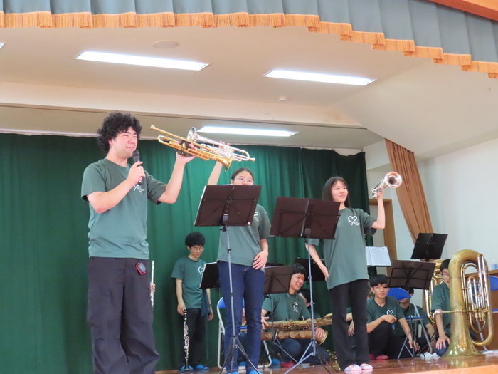 9月14日は敬老参観でした。 まずは、宮崎大学吹奏楽部の皆さんが素晴らしい演奏を聞かせてくれて、子ども達は手拍子したり体を揺らしたりしながら楽しそうに聴いていました(*^^*) その後は、おじいちゃんおばあちゃんやお父さんお母さん方と一緒に、運動会の玉入れで使う玉作り‼ 完成したら玉入れ競争をして、大盛り上がりのひと時でした♡ | ||
