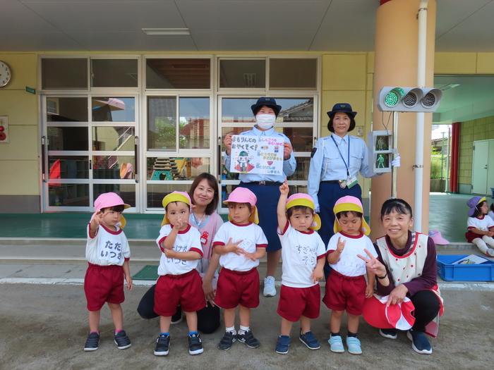交通安全協会から指導員の方に来ていただき、道路を渡る時のお約束を聞いた後、横断歩道を歩く練習をしました(*^^*)