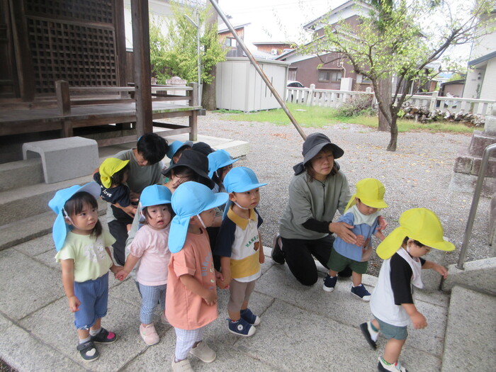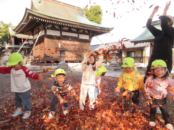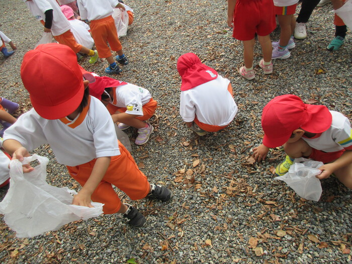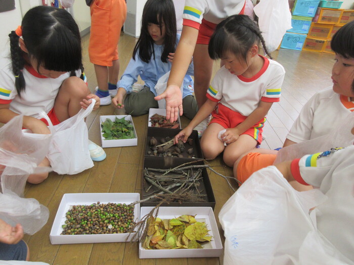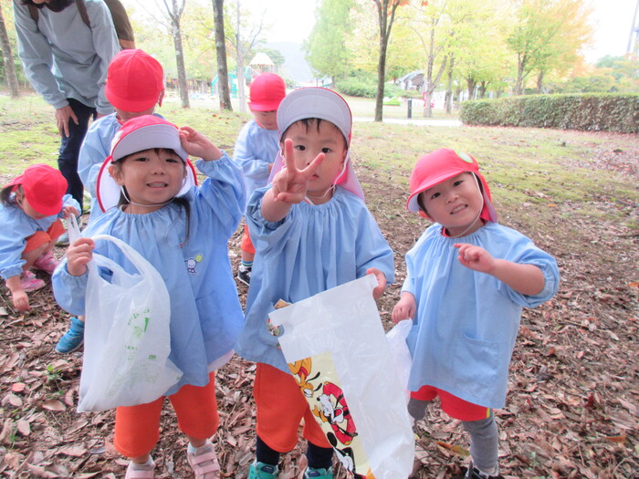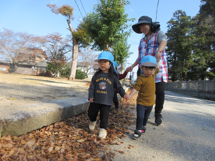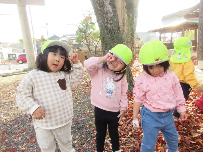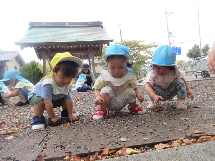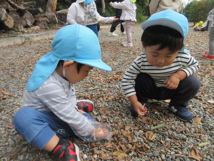 遠足や散歩でさまざまな秋の自然に触れて楽しんでくれていました。 「ここのどんぐり大きい!」と甘呂神社とひばり公園で大きさが違うことなどさまざまなことを発見してくれていましたよ。 | ||
